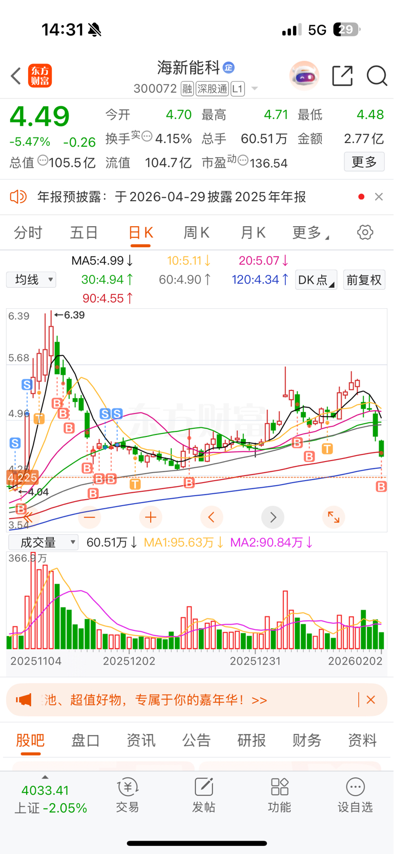 $海新能科(SZ300072)$ 4.225,成本线被我买高了。