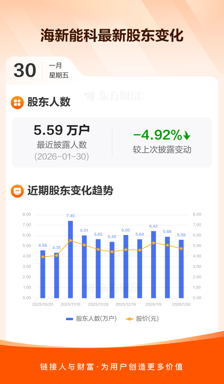 海新能科:截至1月30日最新股东户数5.59万户,较上期减少4.92%