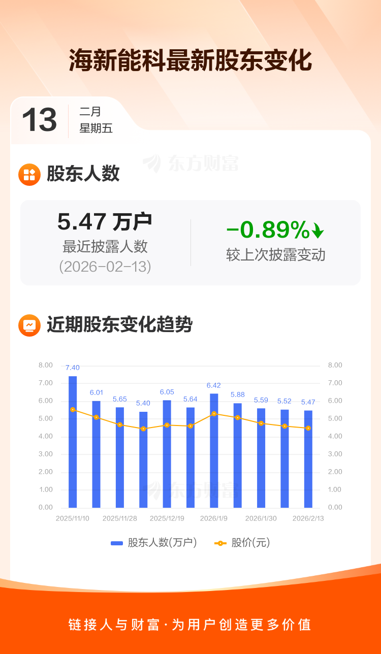海新能科最新披露数据显示,截至2月13日公司股东户数为5.47万户,较上期(2026年2月10日)减少489户,降幅为0.89%。户均持有流通股数量由上期的4.22万股上升至4.26万股,户均持股金额由上期的19.39万元减少至19.10万元。
