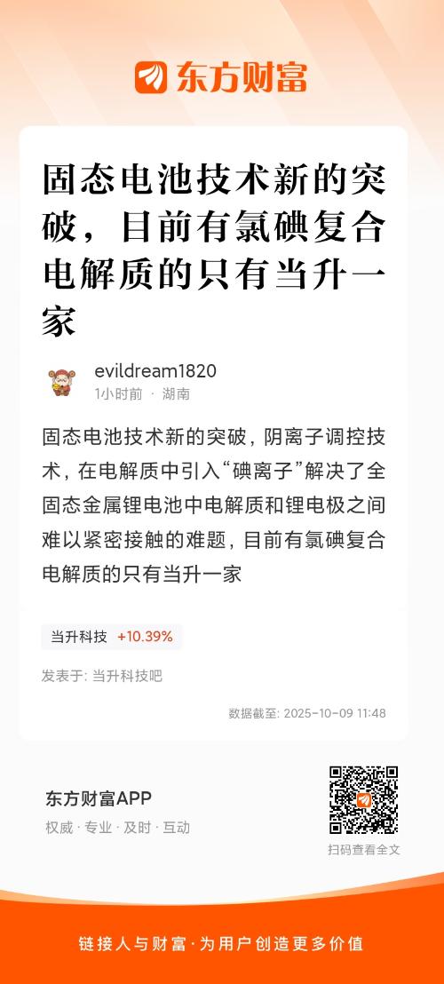 固态电池技术新的突破,阴离子调控技术,在电解质中引入“碘离子”解决了全固态金属锂电池中电解质和锂电极之间难以紧密接触的难题,目前有氯碘复合电解质的只有当升一家