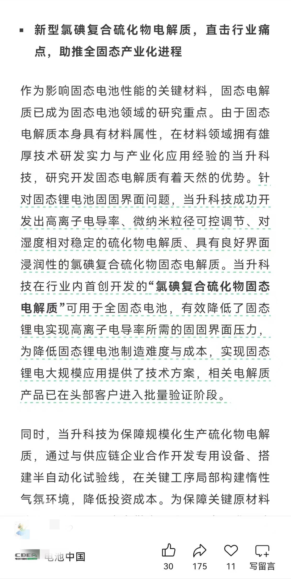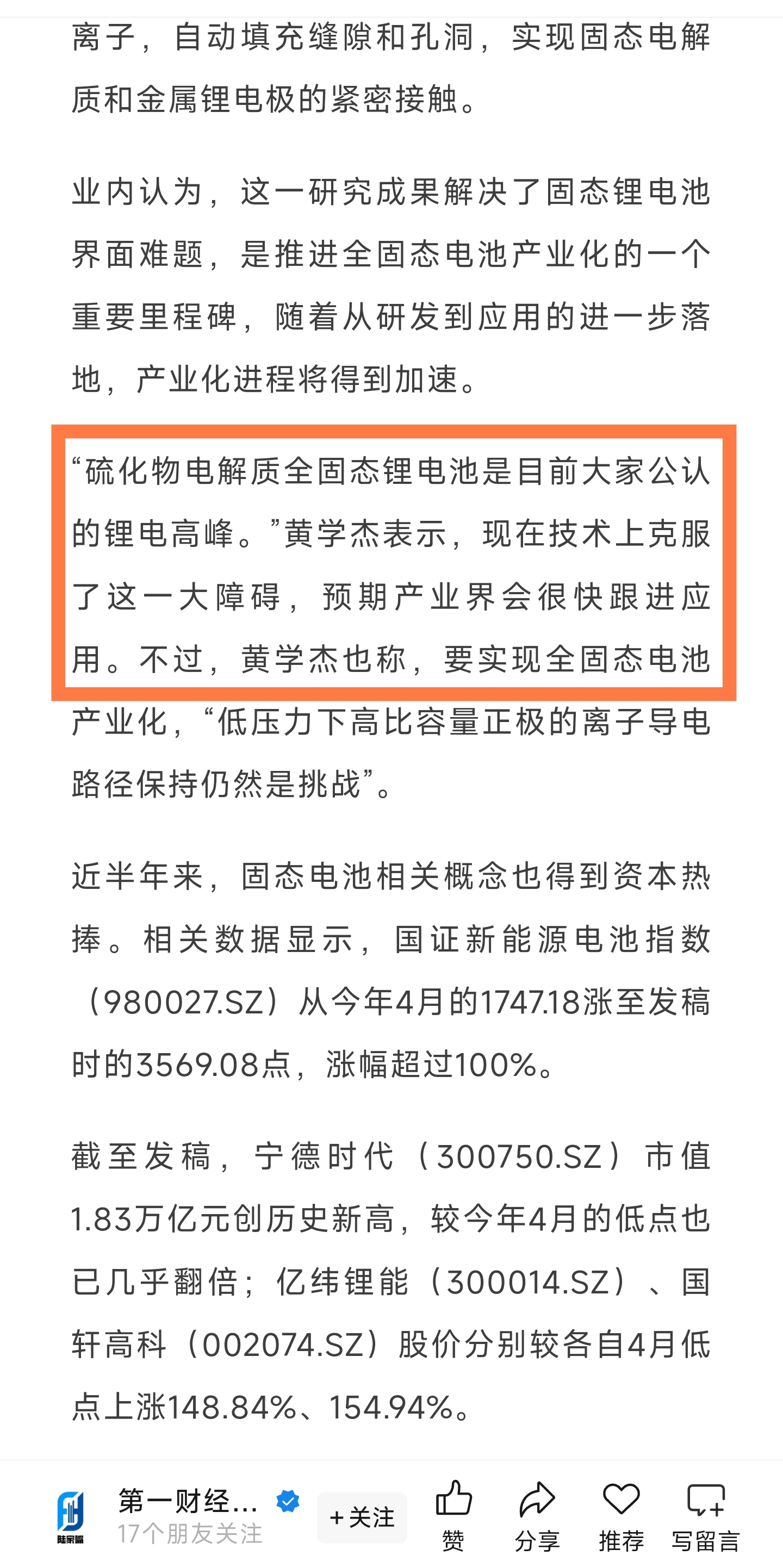 第一财经对黄学杰的专访,固态电解质攻克难题后,产业界会快速跟进应用,当升目前是唯