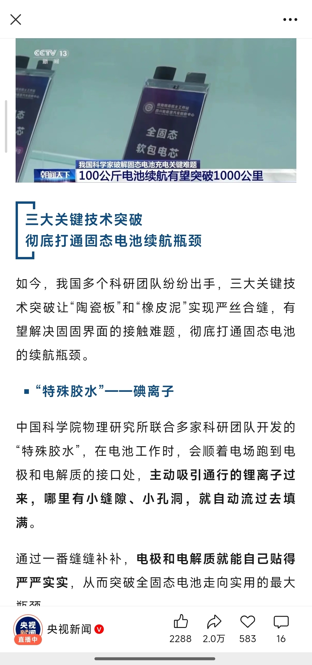 $当升科技(SZ300073)$ 昨天刚公布和博苑战略合作,今天央视新闻就报道固态电池新突破,长期看好
