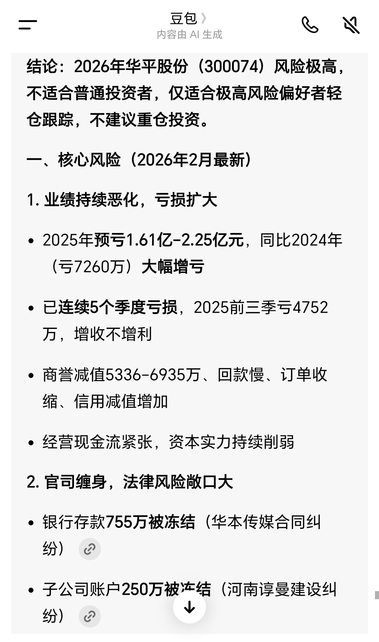 注意投资风险哦华平股份2025年业绩预亏损2.25亿,且是持续亏损,并且是亏损持