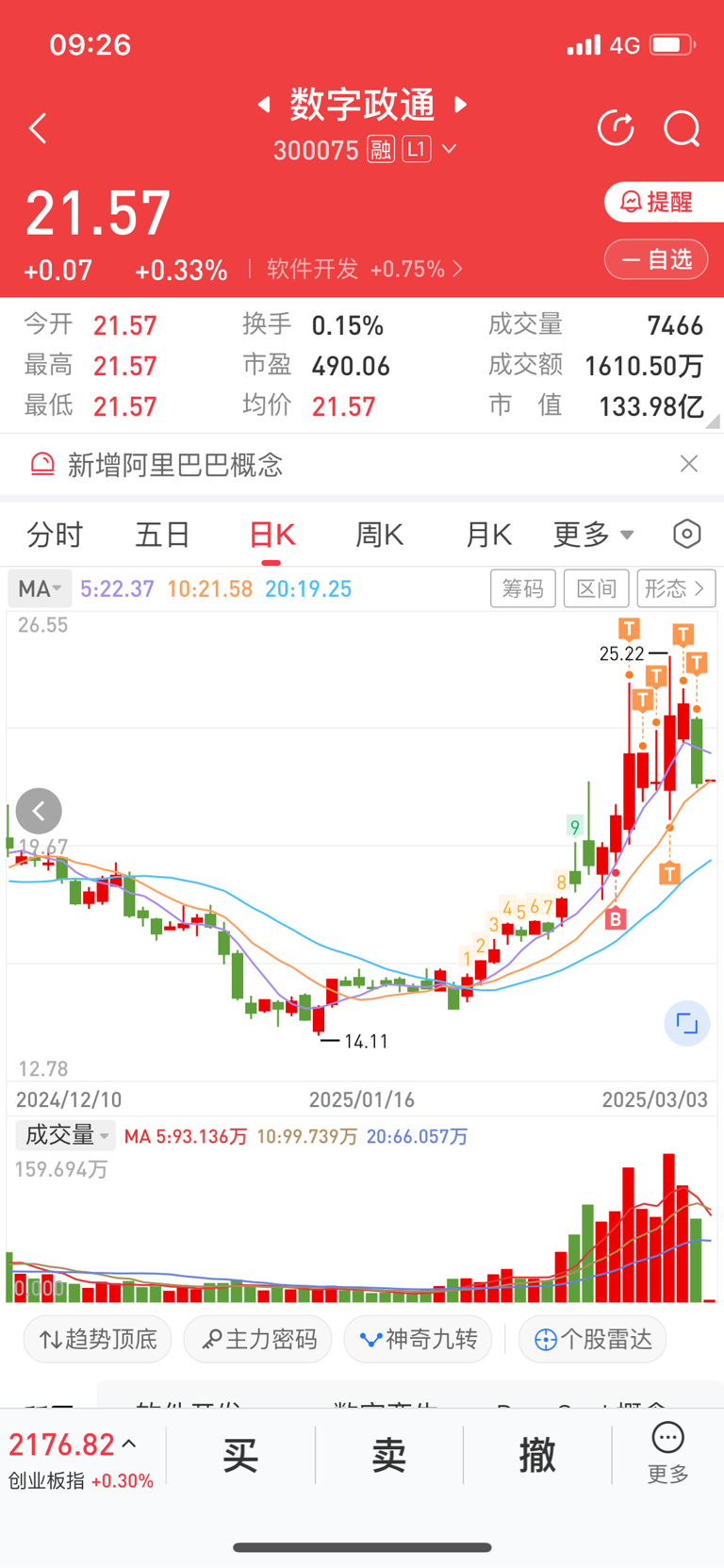 今天是我满仓买入300075以来第一次红开