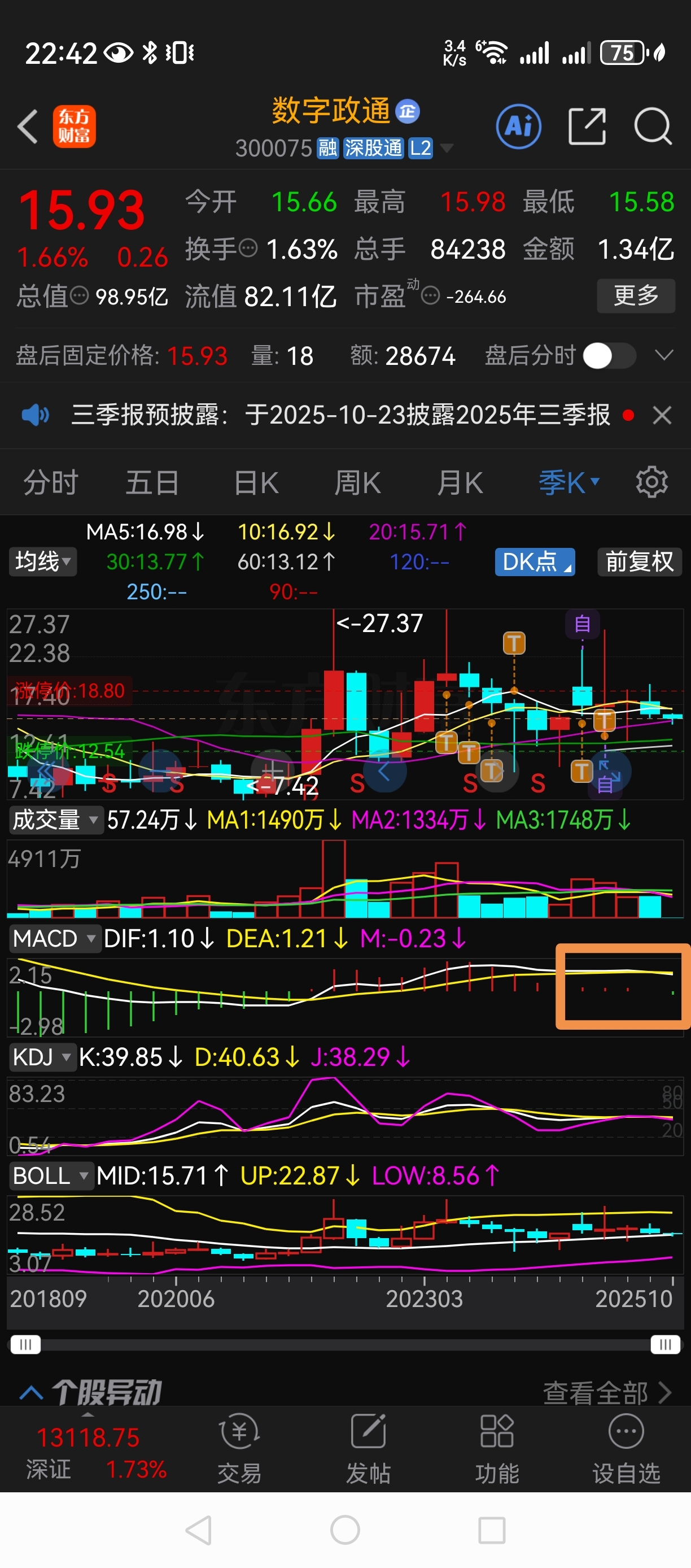 $数字政通(SZ300075)$ 季线死叉了,出了绿角线,下跌趋势,阴跌震荡开始