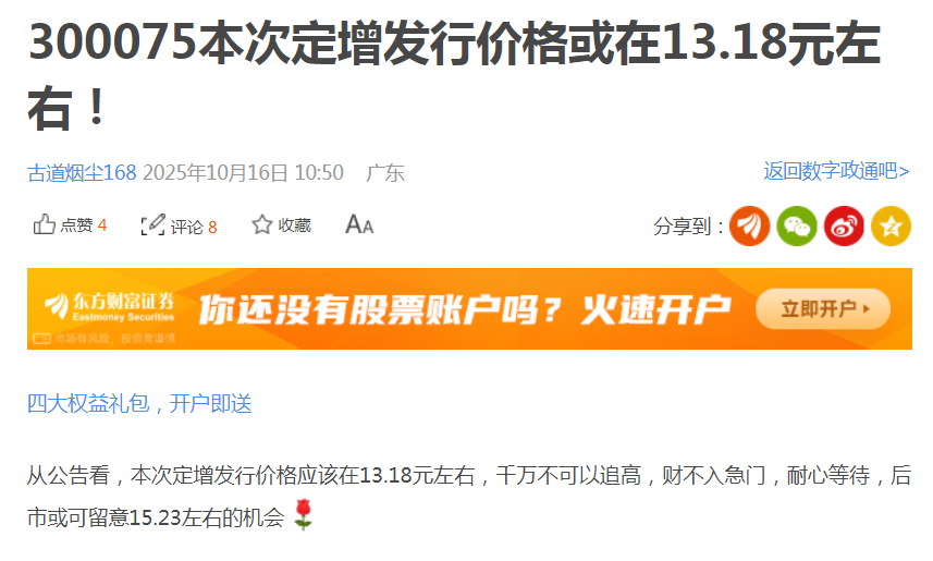 上贴10月16日说了(下图),“从公告看,本次定增发行价格应该在13.18元左右,千万不可以追高,财不入急门,耐心等待,后市或可留意15.23左右的机会”,基本在预期之中......