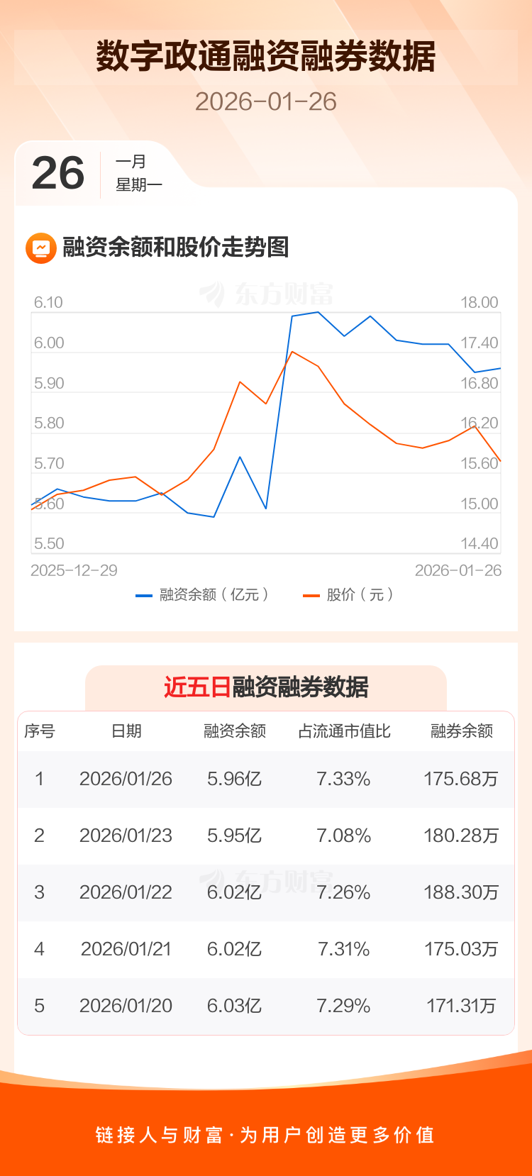 交易所最新数据显示,数字政通于2026年1月26日获融资买入3557.13万元,融资偿还3478.90万元,当日融资净买入78.23万元。目前,该股融资余额5.96亿,占流通市值比例为7.33%。