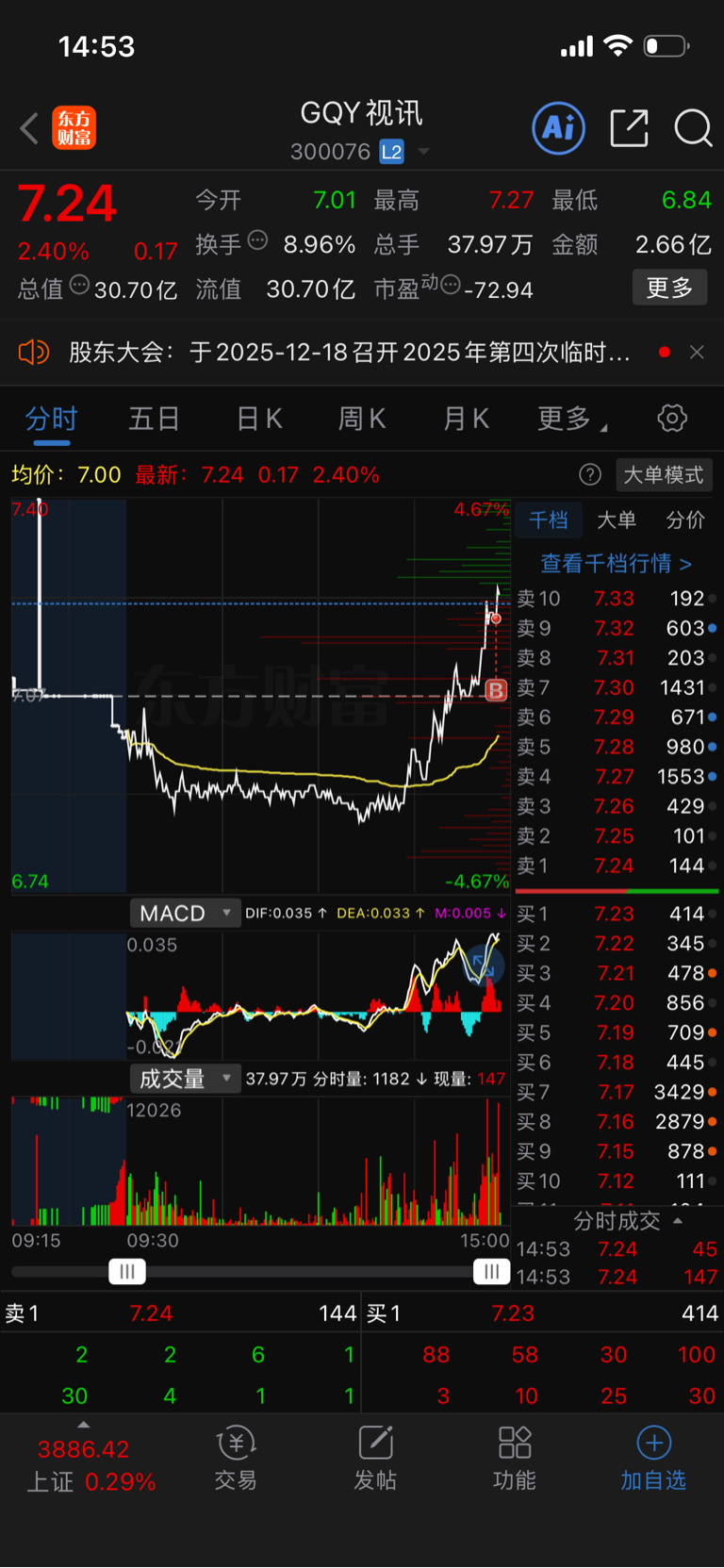 $GQY视讯(SZ300076)$ 尾盘小试视讯,周一冲高卖出。