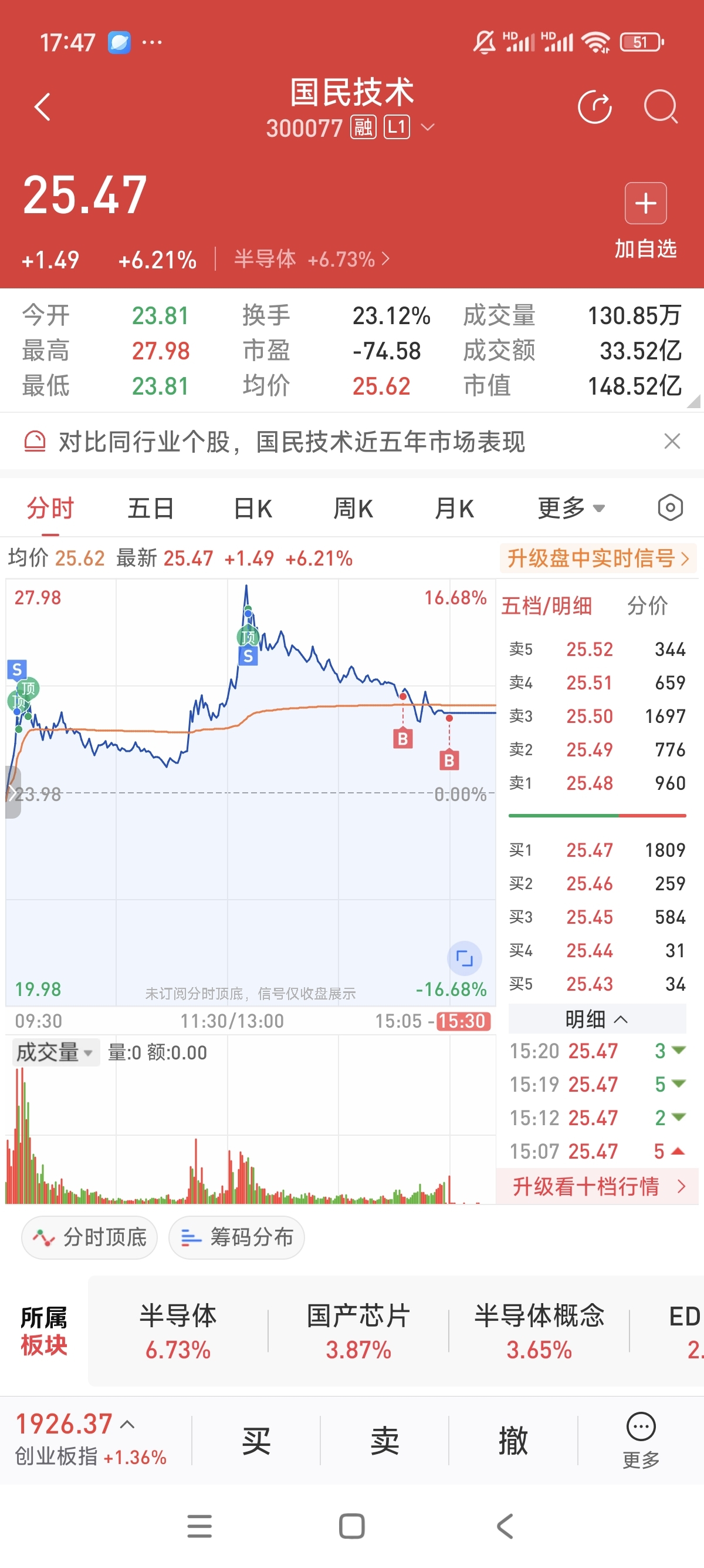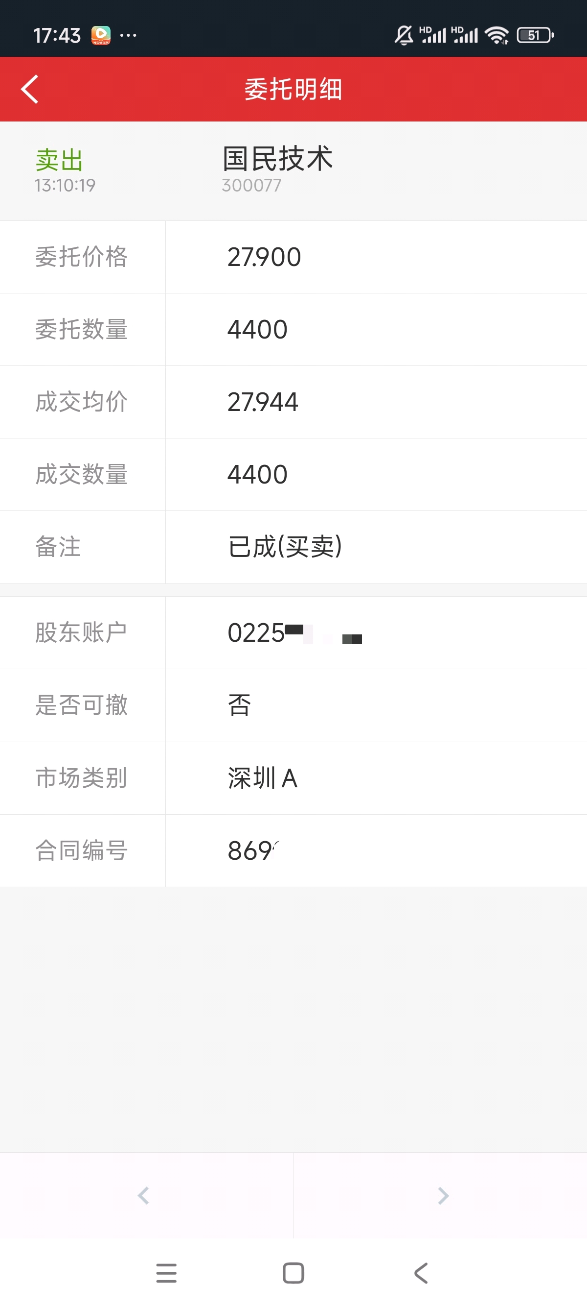 $国民技术(SZ300077)$ 昨天操作一共4笔,卖2笔,买了2笔,感觉还行吧,有一笔27.94成交的,两个手机一个看实时成交明细,一个做下单手机,主力给了机会把成本降低点也好的,希望大家周一还能有盈利。
