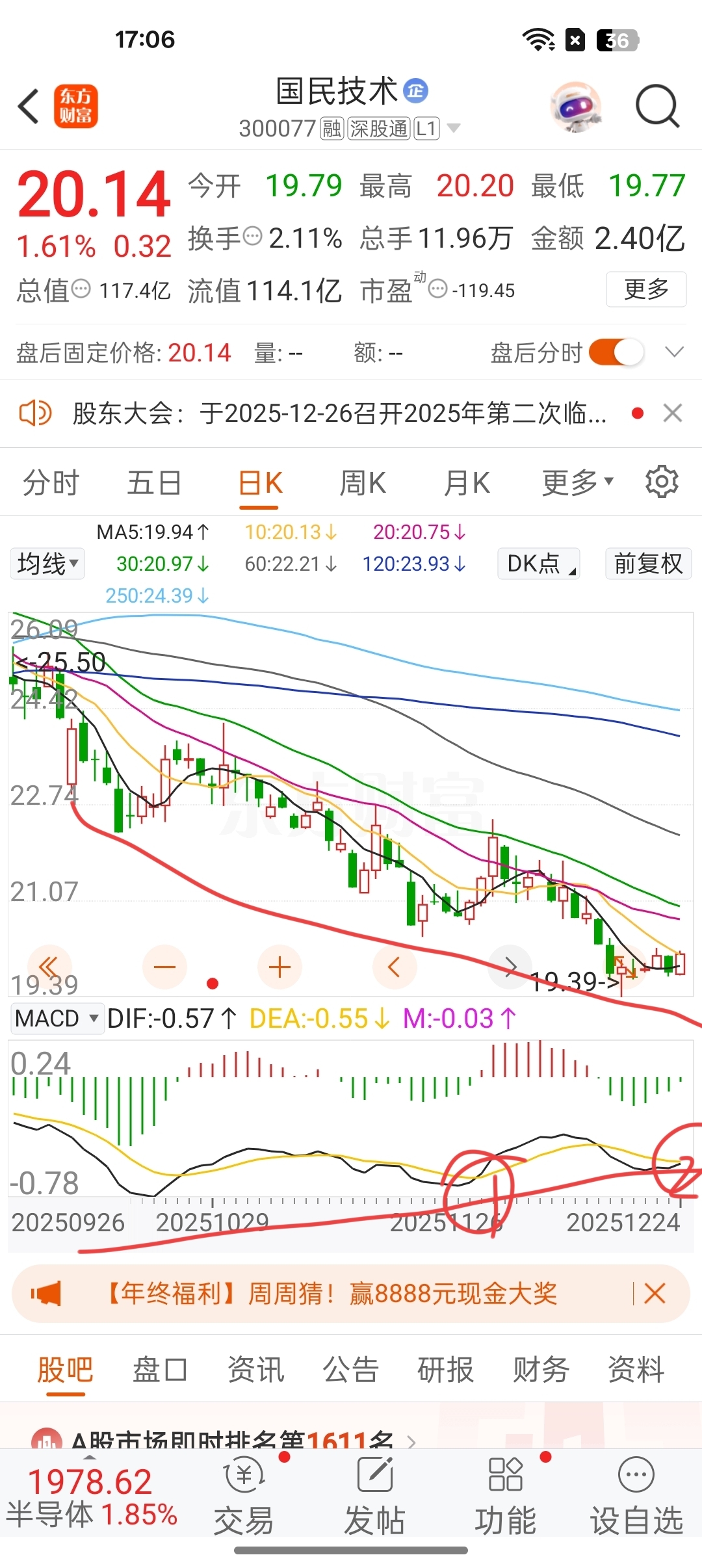 11月24日,日线第一次底背离,12月17日,日线第二次底背离。量化操控下,技术确实不可信,但日线二次底背离,也说明卖盘稀少了,差不多到底了,是反转向上还是横盘磨盘,看主力了。但二次底背离,下挫空间基本不大了。任凭你量化砸盘打压做空套利,该卖的卖了,躺平的不动了,任凭量化雇的托儿天天刷屏唱空,谁都不动了,自己对倒赚自己差价吗?还是量化相互厮杀??两个取迎彤的,还有几个,都是领狗粮的。