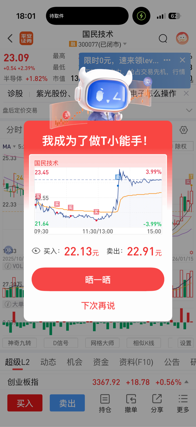 $国民技术(SZ300077)$ 今天做了一下T、 明天不管涨跌! 把剩下的出完