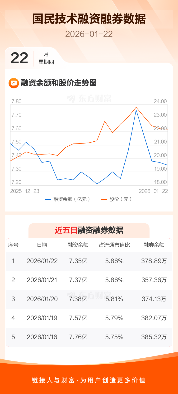交易所最新数据显示,国民技术于2026年1月22日获融资买入3495.82万元,融资偿还3687.25万元,当日融资净偿还191.43万元。目前,该股融资余额7.35亿,占流通市值比例为5.86%。