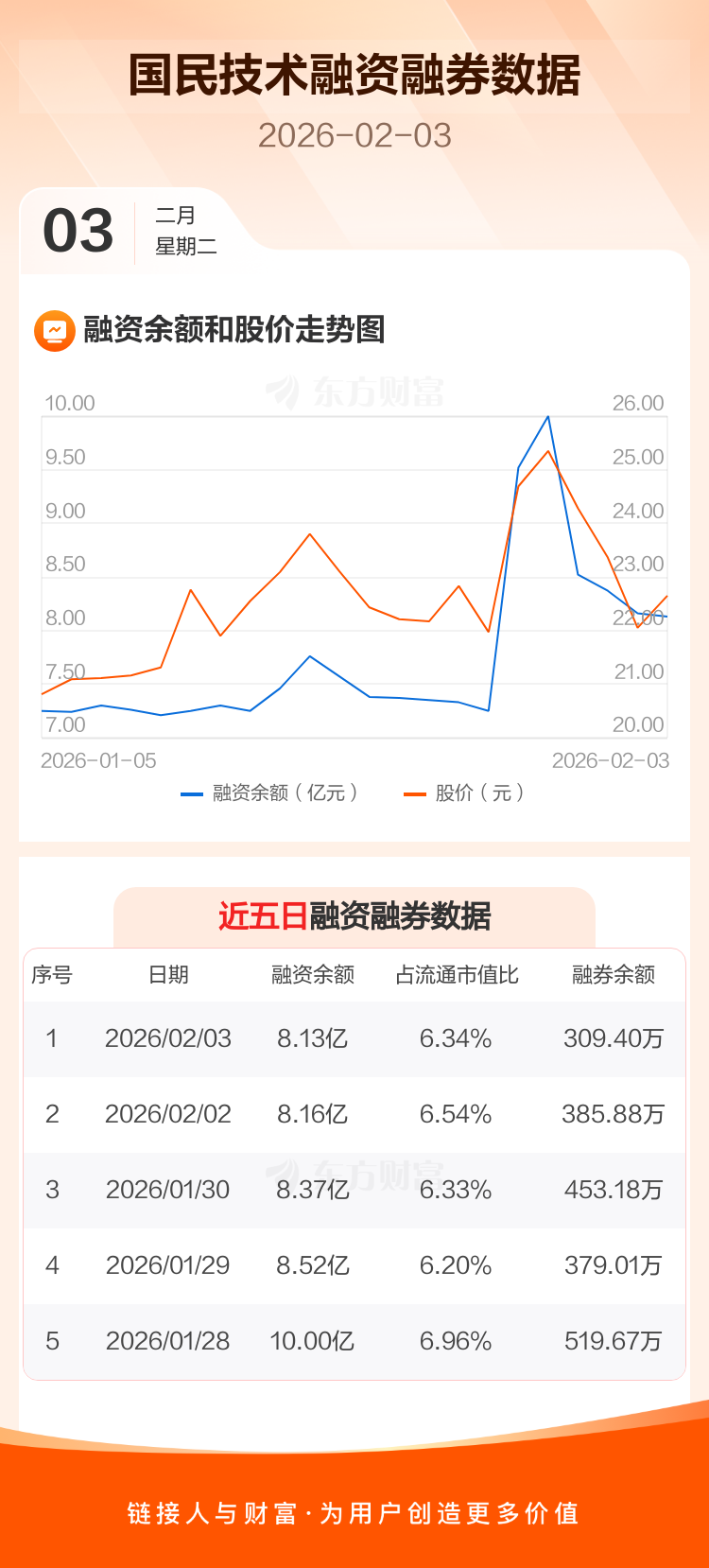 交易所最新数据显示,国民技术于2026年2月3日获融资买入5287.50万元,融资偿还5645.72万元,当日融资净偿还358.22万元。目前,该股融资余额8.13亿,占流通市值比例为6.34%。