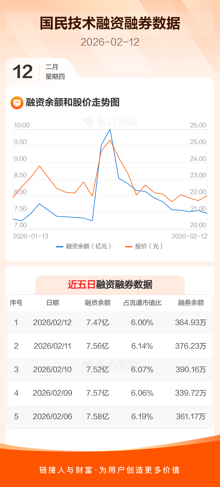 交易所最新数据显示,国民技术于2026年2月12日获融资买入4818.55万元,融资偿还5639.60万元,当日融资净偿还821.05万元。目前,该股融资余额7.47亿,占流通市值比例为6.00%。