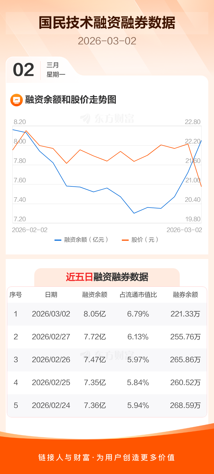交易所最新数据显示,国民技术于2026年3月2日获融资买入8076.38万元,融资偿还4756.74万元,当日融资净买入3319.65万元。目前,该股融资余额8.05亿,占流通市值比例为6.79%。