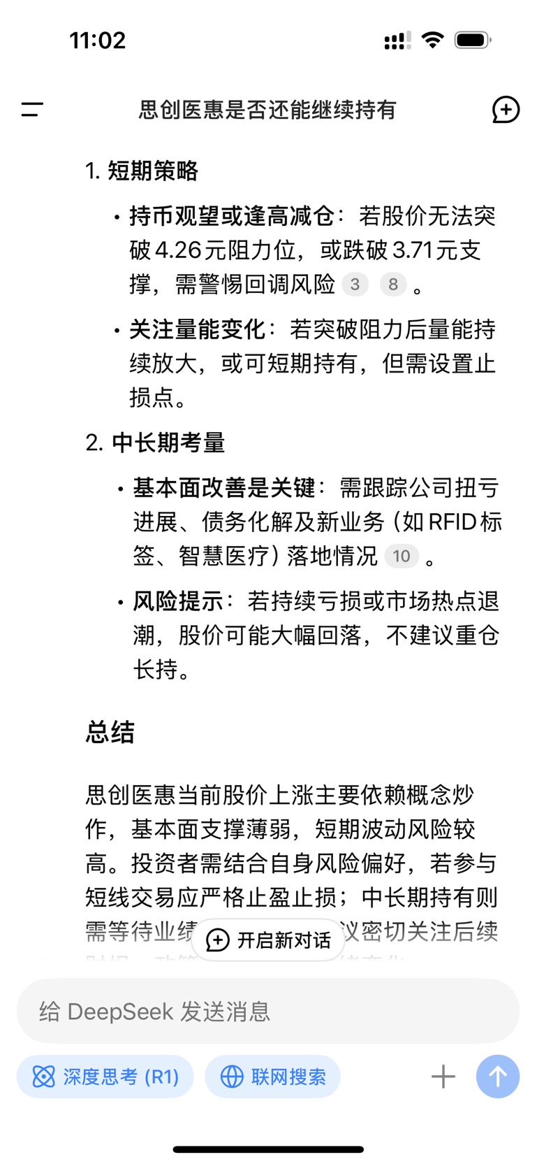 $思创医惠(SZ300078)$ 看看DeepSeek怎么回答思创医惠是否可以持有这个问题。
