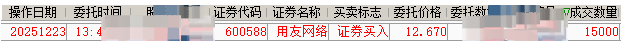 这几天在文档和直播间里面还给大家讲了软件指数是贴着5天线向上攀升,后面还有加速上涨的过程,昨天软件指数就涨了9%,这是不是软件指数加速上涨呢,个人认为现在软件指数还是刚刚开始加速,大家把手中的个股给我死死的拿好来,软件里面有一大批的票现在的位置离24年8月份的那个底部的位置起来只上到了百分之三四十,这个位置已经是很低了,上方的空间是比较大的,看看我在12月23号都买了哪些软件类的个股,现在持有软件哪些个股。看了之后你还会天天想着去追高吗?在直播间里面我是明着给你们讲了去加仓软件,而且说了就是买错了也是买点,上星期四星期五还在直播间里面给大家讲到去加仓软件用友网络,而且说了加错了都是加仓点,用友网络已经两涨停。在12月23号26号我都在提示我在加仓软件,头调文章有详解