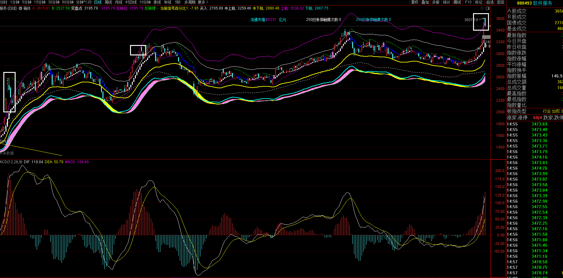 昨天为什么我会去给大家讲到软件相关的科技会进入到短期的震荡呢,是由于昨天的那个阳线太大了,已经到了箱体指标上轨的位置,每一次不管是软件指数还是其他的板块只要到了上轨的位置就会有短期的回调,软件相关的科技回踩5天线或者10天线依然是买点,个人认为这个地方是倒车接人拿好就可以