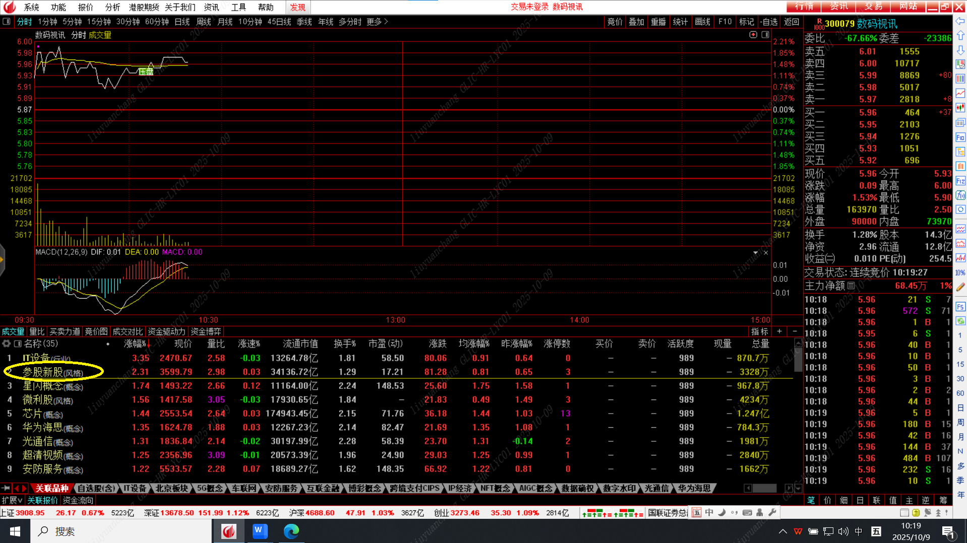 软件上,300079多了一个概念,参股新股,如图左下角椭圆所示,不知道参与了什么新股