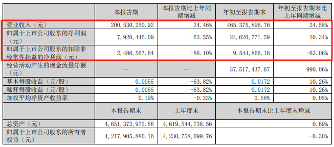 其中,第三季度,公司营业收入为2.01亿元,同比上升24.46%;归母净利润为792万元,同比下降63.55%;扣非归母净利润为248.66万元,同比下降88.10%。