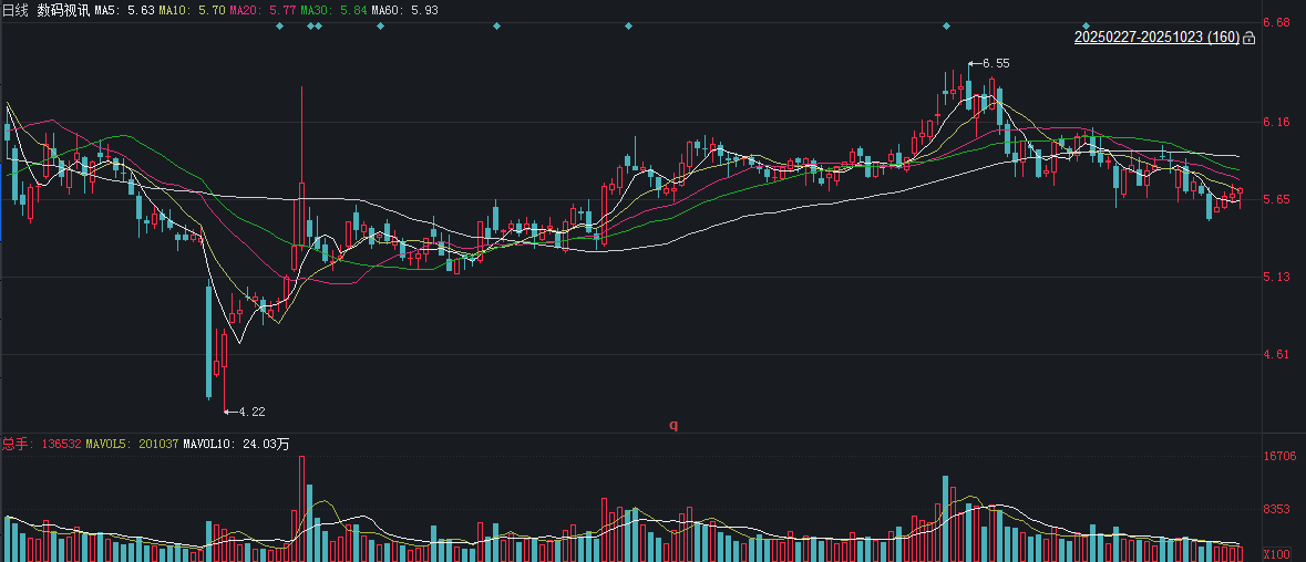 二级市场上,截至23日收盘,数码视讯上涨0.53%报5.71元/股,总市值约81.43亿元,今年来公司股价近乎“原地踏步”。