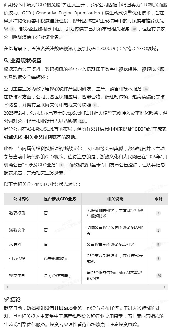 数码视讯目前未涉及GEO(生成式引擎优化)业务,也未将其列为公司重点发展方向。