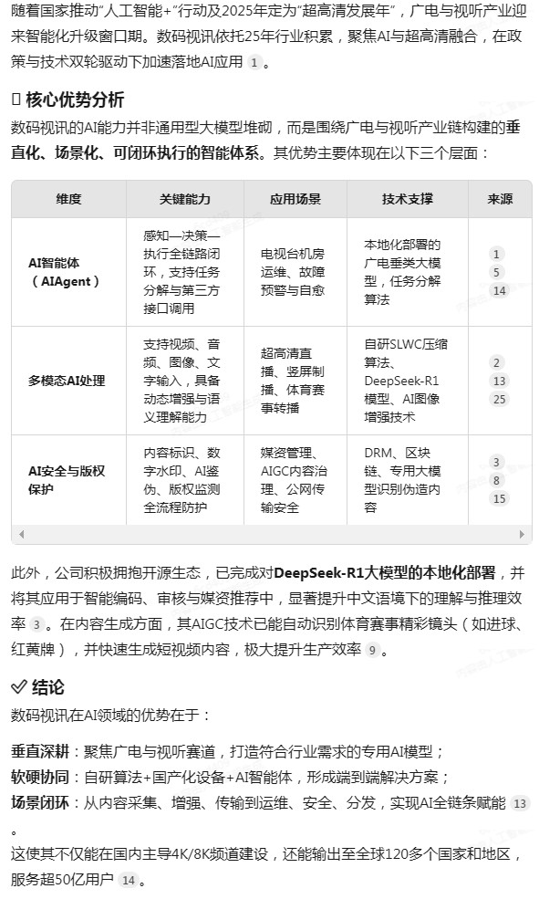 数码视讯在AI领域已形成以“垂直大模型+多模态智能体”为核心的差异化优势,通过将AI深度融入超高清视频生产、广电运维与内容安全等场景,实现从“辅助工具”到“自主执行”的跨越。