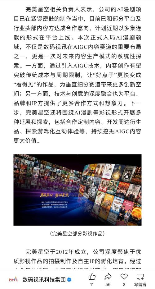 数码视讯旗下影视公司A漫剧即将上线完美星空相关负责人表示,公司的AI漫剧项目已在