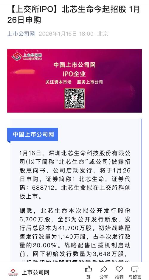 数码视讯投资的深圳北芯生命科技股份有限公司将在1月26号申购