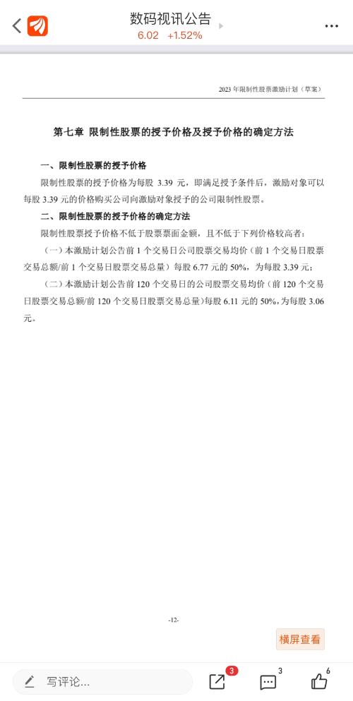 数码视讯2023年员工持股计划本激励计划公告前 1 个交易日公司股票交易均价(前 1 个交易日股票 交易总额/前 1 个交易日股票交易总量)每股 6.77 元的 50%,为每股 3.39 元;利空打压到2026年继续进行员工持股,员工持股买入价为回购50%,对半利益输送,等待重大利空落地$上证指数(SH000001)$ $数码视讯(SZ300079)$