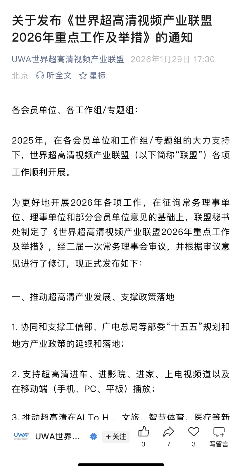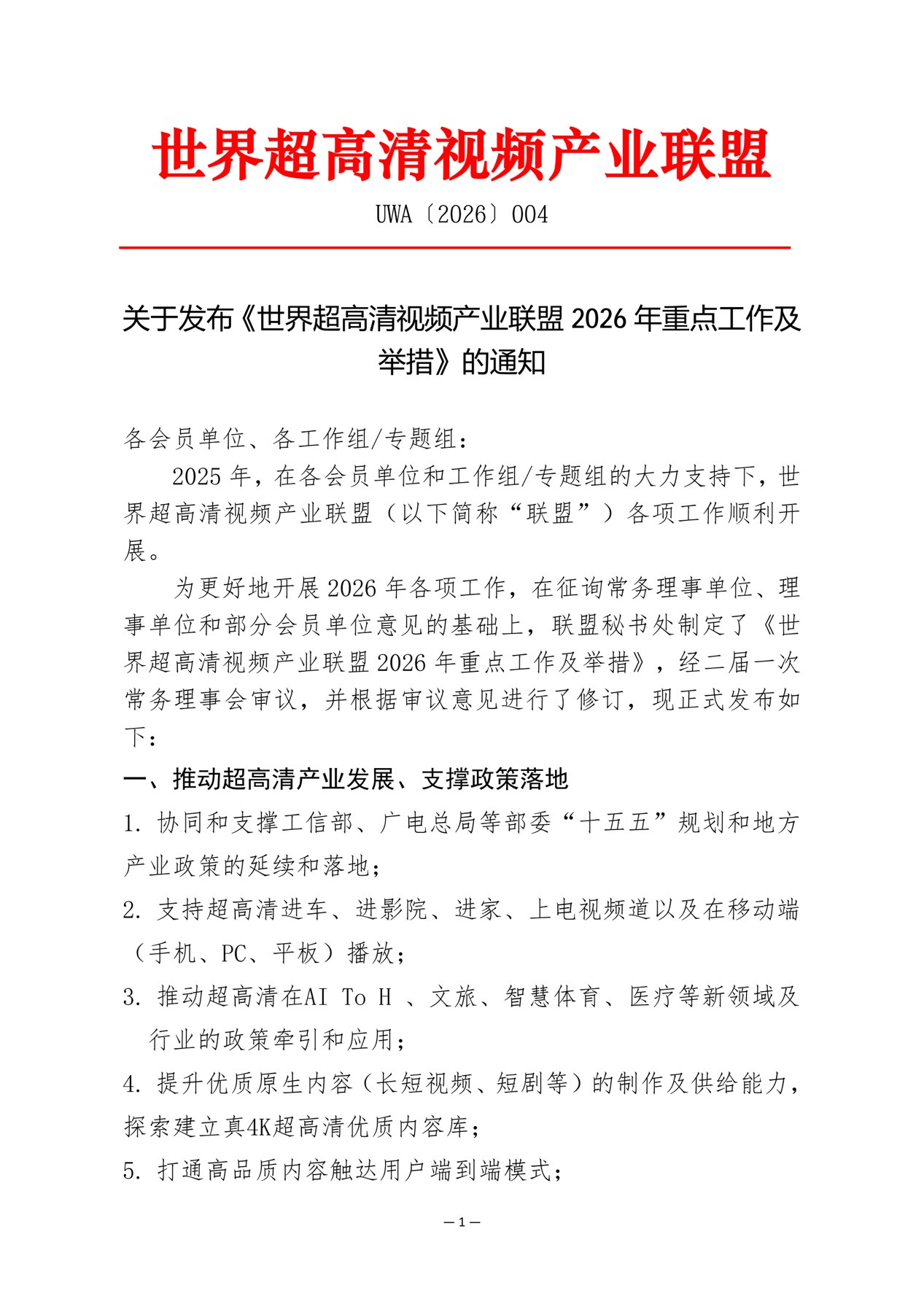 关于发布《世界超高清视频产业联盟2026年重点工作及举措》的通知