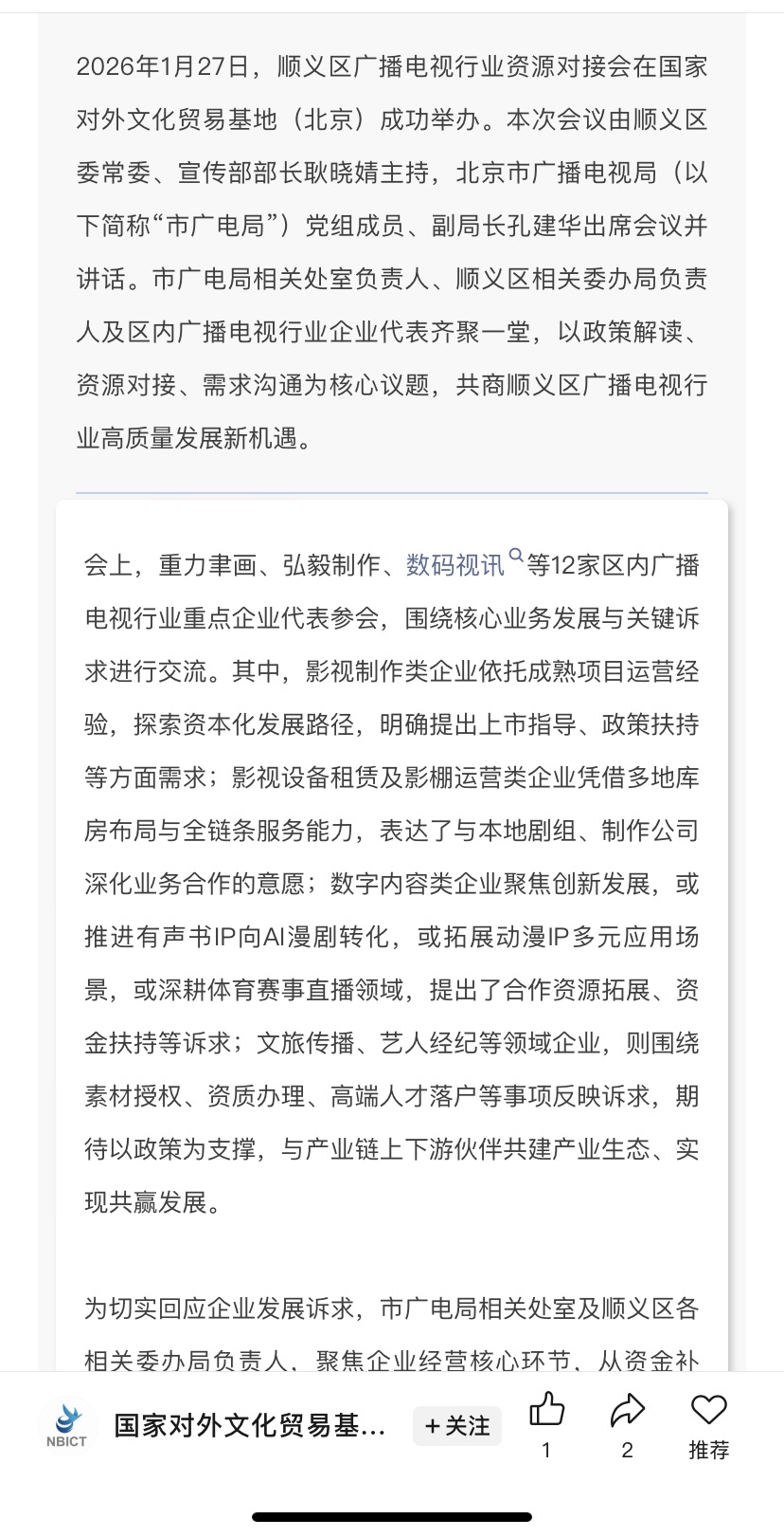 加快推进AI漫剧上市2026年1月27日,顺义区广播电视行业资源对接会在国家对外文化贸易基地(北京)成功举办。$上证指数(SH000001)$ $数码视讯(SZ300079)$ 会上,重力聿画、弘毅制作、数码视讯等12家区内广播电视行业重点企业代表参会,围绕核心业务发展与关键诉求进行交流。其中,影视制作类企业依托成熟项目运营经验,探索资本化发展路径,明确提出上市指导、政策扶持等方面需求;影视设备租赁及影棚运营类企业凭借多地库房布局与全链条服务能力,表达了与本地剧组、制作公司深化业务合作的意愿;数字内容类企业聚焦创新发展,或推进有声书IP向AI漫剧转化,或拓展动漫IP多元应用场景,或深耕体育赛事直播领域,提出了合作资源拓展、资金扶持等诉求;文旅传播、艺人经纪等领域企业,则围绕素材授权、资质办理、高端人才落户等事项反映诉求,期待以政策为支撑,与产业链上下游伙伴共建产业生态、实现共赢发展。为切实回应企业发展诉求,市广电局相关处室及顺义区各相关委办局负责人,聚焦企业经营核心环节,从资金补贴、人才支持、金融扶持、产业协同等多个维度,对相关针对性政策进行了详细解读,就企业发展所需的各项支持举措、申请条件及办理流程作出全面说明,为广播电视行业高质量发展提供全方位、强有力的政策赋能。