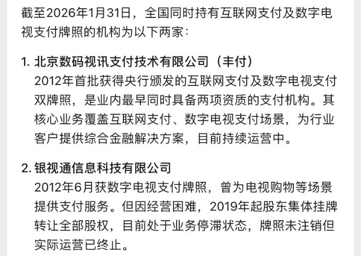 截至2026年1月31日,全国同时持有互联网支付及数字电视支付牌照的机构为以下两家:北京数码视讯支付技术有限公司(丰付)2012年首批获得央行颁发的互联网支付及数字电视支付双牌照,是业内最早同时具备两项资质的支付机构。其核心业务覆盖互联网支付、数字电视支付场景,为行业客户提供综合金融解决方案,目前持续运营中。银视通信息科技有限公司2012年6月获数字电视支付牌照,曾为电视购物等场景提供支付服务。但因经营困难,2019年起股东集体挂牌转让全部股权,目前处于业务停滞状态,牌照未注销但实际运营已终止。$上证指数(SH000001)$ $数码视讯(SZ300079)$