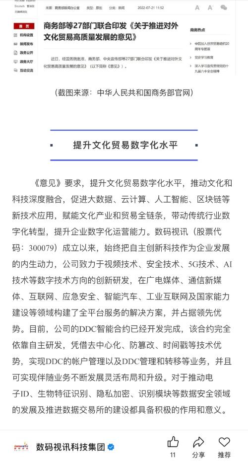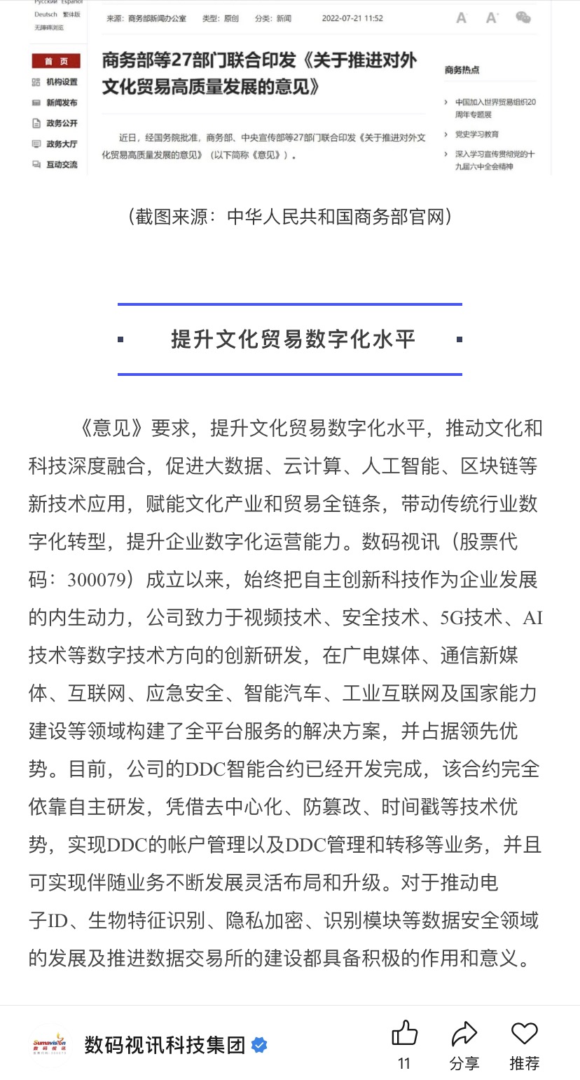 数码视讯公司的DDC智能合约已经开发完成,该合约完全依靠自主研发,凭借去中心化、防篡改、时间戳等技术优势,实现DDC的帐户管理以及DDC管理和转移等业务,并且可实现伴随业务不断发展灵活布局和升级。对于推动电子ID、生物特征识别、隐私加密、识别模块等数据安全领域的发展及推进数据交易所的建设都具备积极的作用和意义。$上证指数(SH000001)$ 《意见》中还明确提出,完善知识产权保护体系和纠纷多元化解决机制,深化知识产权保护国际合作;加大数字版权保护力度,强化版权全链条保护和开发利用,激发企业创新创造活力。数码视讯(股票代码:300079)作为ChinaDRM标准组的首批成员,全程参与了ChinaDRM标准的制定,同时作为国家数字电视密码技术专项工作组、DCAS标准组、TVOS标准组等成员,深度参与“GY/T 255-2012可下载条件接收系统技术规范”、“GY/T 308-2017单向可下载条件接收系统技术规范”、“GY/T 277—2019视音频内容分发数字版权管理技术规范”等标准制定。数码视讯也是国内少有可提供数字内容加密技术、数字内容水印技术及数字内容传输链路保护技术的厂商之一。目前,公司在包括DRM云服务等在内的版权保护与新技术结合方面持续进行前沿探索。