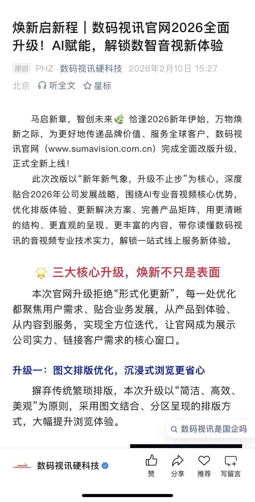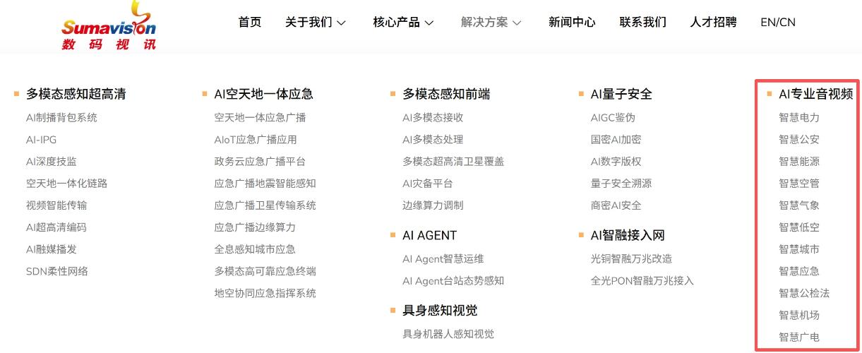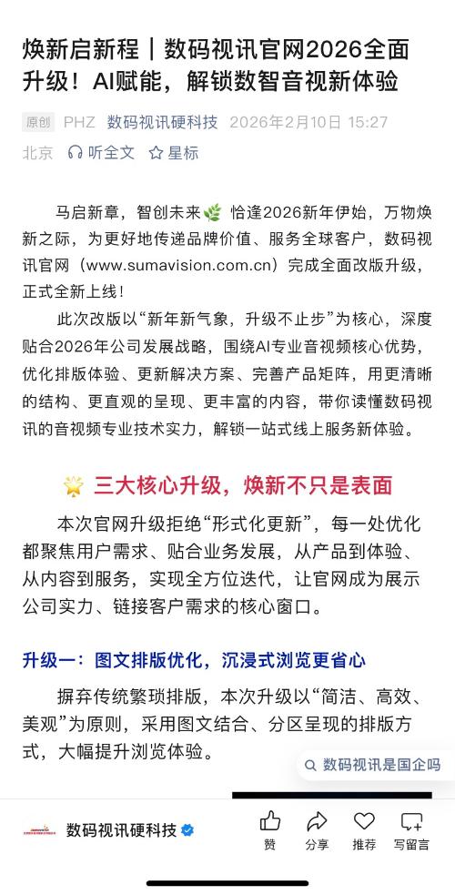数码视讯紧跟行业发展趋势,贴合2026年数智化转型需求,本次官网全面更新智慧广电、智慧应急、智慧城市、智慧低空经济等11大行业解决方案,覆盖传媒、安全、政务、新经济等多个核心领域,展现数码视讯多赛道布局的综合实力。$上证指数(SH000001)$ $利欧股份(SZ002131)$ 从智擎显示调度系统、智席协作系统、智融拼接系统等硬件产品,到AI融合决策系统、AI信发播控系统、智能图传系统等软件解决方案,每一款产品都详细标注核心优势与应用场景,清晰展现我们在视频处理、传输、呈现、融合全链路的核心竞争力,让你快速找到适配自身需求的产品与服务,直观感受AI赋能音视频产业的变革力量。
