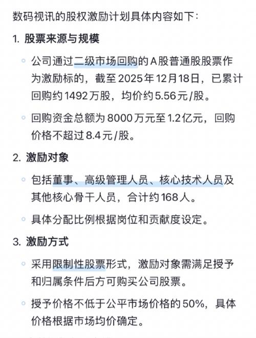 数码视讯2026年股权激励,授予价格不低于公平市场价格的50%,具体价格根据市场均价确定。回购平均成本5.6元,168名员工以半价买入回购股份激励$上证指数(SH000001)$ $数码视讯(SZ300079)$ 重大利空将在年报后落地