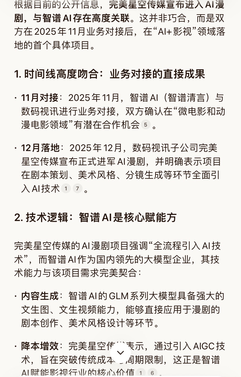 根据目前的公开信息,完美星空传媒宣布进入AI漫剧,与智谱AI存在高度关联。这并非巧合,而是双方在2025年11月业务对接后,在“AI+影视”领域落地的首个具体项目。$上证指数(SH000001)$ 1. 时间线高度吻合:业务对接的直接成果• 11月对接:2025年11月,智谱AI(智谱清言)与数码视讯进行业务对接,双方确认在“微电影和动漫电影领域”有潜在合作机会。• 12月落地:2025年12月,数码视讯子公司完美星空传媒宣布正式进军AI漫剧,并明确表示项目在剧本策划、美术风格、分镜生成等环节全面引入AI技术。2. 技术逻辑:智谱AI是核心赋能方完美星空传媒的AI漫剧项目强调“全流程引入AI技术”,而智谱AI作为国内领先的大模型企业,其技术能力与该项目需求完美契合:• 内容生成:智谱AI的GLM系列大模型具备强大的文生图、文生视频能力,能够直接应用于漫剧的剧本创作、美术风格设计等环节。• 降本增效:完美星空传媒表示,通过引入AIGC技术,旨在突破传统成本与周期限制,这正是智谱AI赋能影视行业的核心价值。$智谱(HK|02513)$ 3. 市场定位:抢占“漫剧元年”赛道2025年被业内视为“漫剧元年”,市场规模预计突破200亿。数码视讯(通过完美星空)与智谱AI的合作,正是为了抢占这一蓝海市场,利用AI技术实现“漫画+动画+短剧”的融合创新。结论:完美星空传媒的AI漫剧项目,是智谱AI与数码视讯业务对接后,在“动漫电影”领域落地的具体实践,智谱AI在其中扮演了技术赋能的关键角色