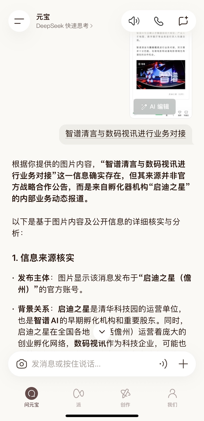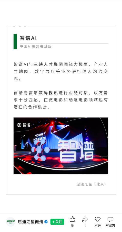 “智谱清言与数码视讯进行业务对接”这一信息确实存在,但其来源并非官方战略合作公告,而是来自孵化器机构“启迪之星”的内部业务动态报道。以下是基于图片内容及公开信息的详细核实与分析:1. 信息来源核实• 发布主体:图片显示该消息发布于“启迪之星(儋州)”的官方账号。$上证指数(SH000001)$ • 背景关系:启迪之星是清华科技园的运营单位,也是智谱AI的早期孵化机构和重要股东。同时,启迪之星在全国各地(包括儋州)运营着庞大的创业孵化网络,数码视讯作为科技企业,可能也是其服务的企业之一,或者双方在启迪之星的平台上进行了资源对接。