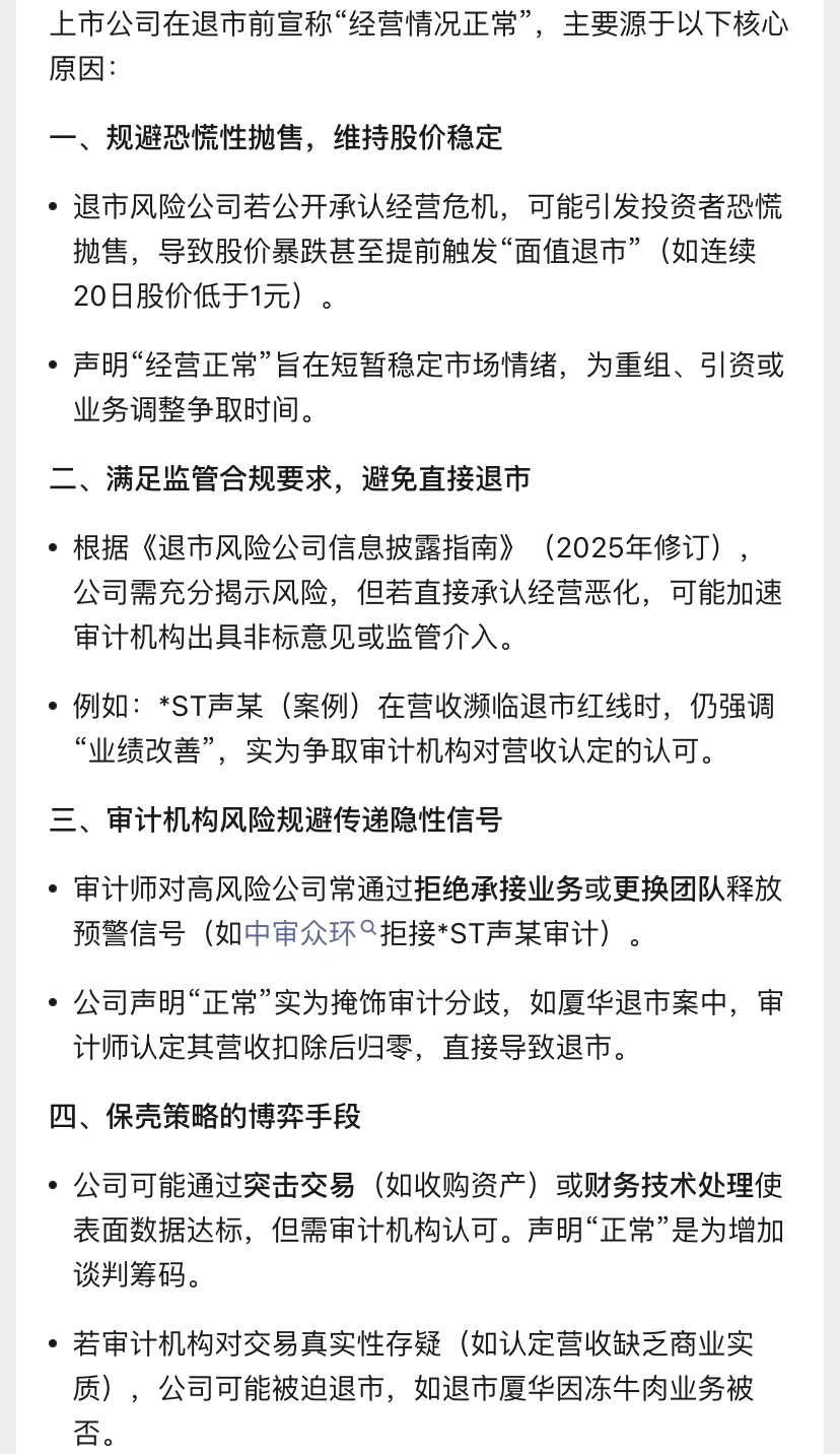 上市公司在退市前宣称“经营情况正常”,主要源于以下核心原因:一、规避恐慌性抛售,维持股价稳定退市风险公司若公开承认经营危机,可能引发投资者恐慌抛售,导致股价暴跌甚至提前触发“面值退市”(如连续20日股价低于1元)。 声明“经营正常”旨在短暂稳定市场情绪,为重组、引资或业务调整争取时间。二、满足监管合规要求,避免直接退市根据《退市风险公司信息披露指南》(2025年修订),公司需充分揭示风险,但若直接承认经营恶化,可能加速审计机构出具非标意见或监管介入。 例如:*ST声某(案例)在营收濒临退市红线时,仍强调“业绩改善”,实为争取审计机构对营收认定的认可。三、审计机构风险规避传递隐性信号审计师对高风险公司常通过拒绝承接业务或更换团队释放预警信号(如中审众环拒接*ST声某审计)。 公司声明“正常”实为掩饰审计分歧,如厦华退市案中,审计师认定其营收扣除后归零,直接导致退市。四、保壳策略的博弈手段公司可能通过突击交易(如收购资产)或财务技术处理使表面数据达标,但需审计机构认可。声明“正常”是为增加谈判筹码。 若审计机构对交易真实性存疑(如认定营收缺乏商业实质),公司可能被迫退市,如退市厦华因冻牛肉业务被否。五、投资者需关注的真实风险信号频繁更换审计机构:可能隐含财务分歧。 营收/利润“精准达标”:如扣非后营收卡在3亿元边缘。 现金流与利润背离:持续经营现金流为负却宣称盈利。 审计进展延迟:多次公告“与审计机构存在重大分歧”$数码视讯(SZ300079)$ $上证指数(SH000001)$