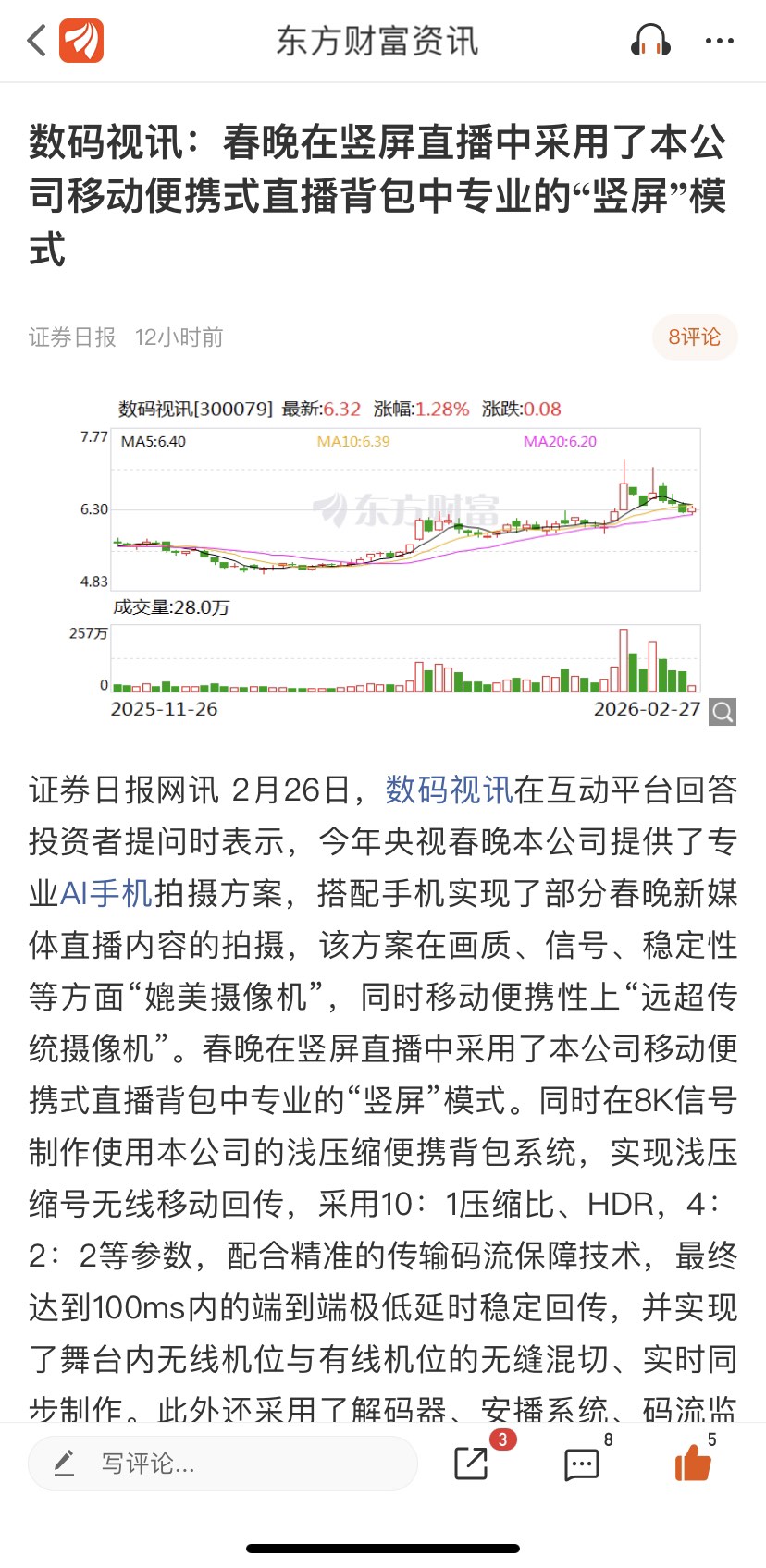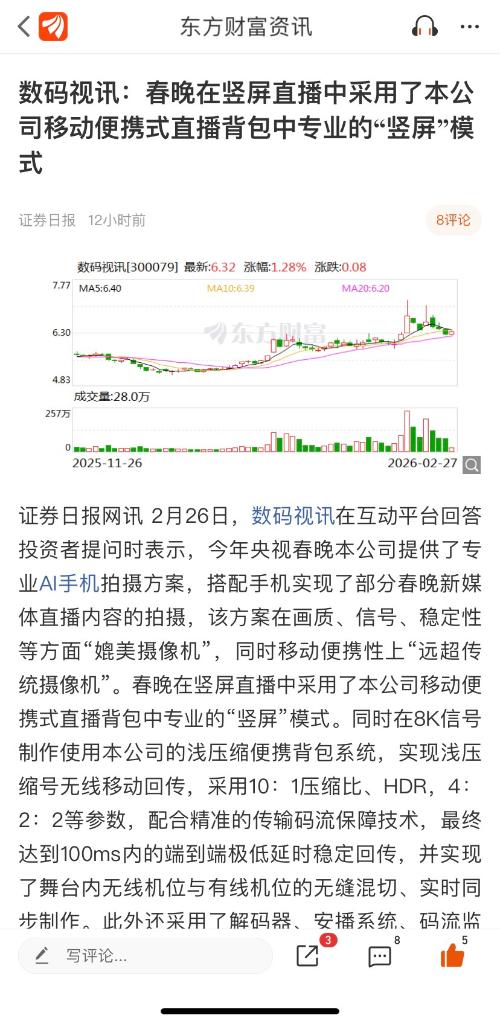 $数码视讯(SZ300079)$ 直接淘汰摄像机!!!!! 2月26日,数码视讯在互动平台回答投资者提问时表示,今年央视春晚本公司提供了专业AI手机拍摄方案,搭配手机实现了部分春晚新媒体直播内容的拍摄,该方案在画质、信号、稳定性等方面“媲美摄像机”,同时移动便携性上“远超传统摄像机”。$上证指数(SH000001)$