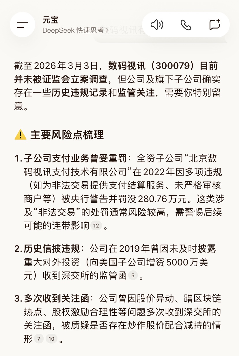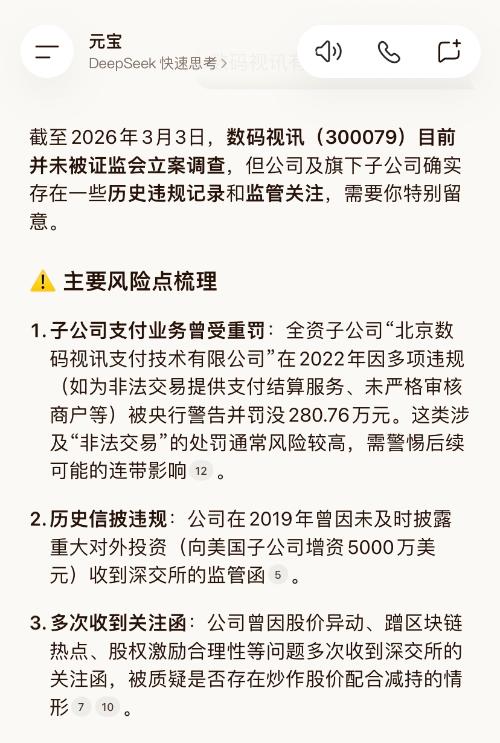 截至2026年3月3日,数码视讯(300079)目前并未被证监会立案调查,但公司及旗下子公司确实存在一些历史违规记录和监管关注,需要你特别留意。$上证指数(SH000001)$ 主要风险点梳理1. 子公司支付业务曾受重罚:全资子公司“北京数码视讯支付技术有限公司”在2022年因多项违规(如为非法交易提供支付结算服务、未严格审核商户等)被央行警告并罚没280.76万元。这类涉及“非法交易”的处罚通常风险较高,需警惕后续可能的连带影响。$数码视讯(SZ300079)$ 2. 历史信披违规:公司在2019年曾因未及时披露重大对外投资(向美国子公司增资5000万美元)收到深交所的监管函。3. 多次收到关注函:公司曾因股价异动、蹭区块链热点、股权激励合理性等问题多次收到深交所的关注函,被质疑是否存在炒作股价配合减持的情形。