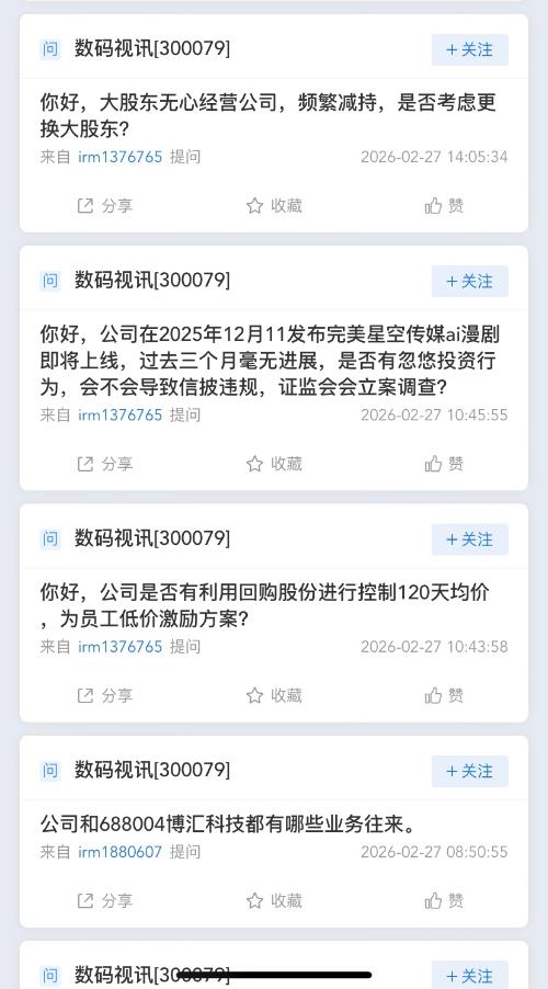 数码视讯董秘接下来要回复的问题:你好,大股东无心经营公司,频繁减持,是否考虑更换大股东?$上证指数(SH000001)$ 你好,公司在2025年12月11发布完美星空传媒ai漫剧即将上线,过去三个月毫无进展,是否有忽悠投资行为,会不会导致信披违规,证监会会立案调查?@界面新闻 你好,公司是否有利用回购股份进行控制120天均价,为员工低价激励方案?@财联社 公司和688004博汇科技都有哪些业务往来?@财中社