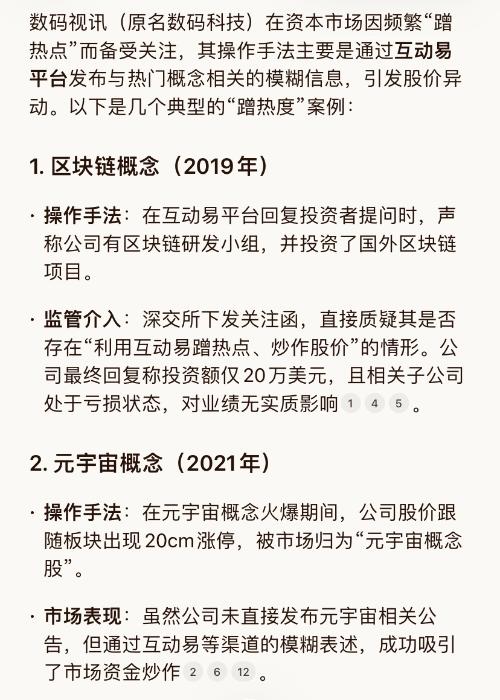 数码视讯(原名数码科技)在资本市场因频繁“蹭热点”而备受关注,其操作手法主要是通过互动易平台发布与热门概念相关的模糊信息,引发股价异动。以下是几个典型的“蹭热度”案例:1. 区块链概念(2019年)• 操作手法:在互动易平台回复投资者提问时,声称公司有区块链研发小组,并投资了国外区块链项目。• 监管介入:深交所下发关注函,直接质疑其是否存在“利用互动易蹭热点、炒作股价”的情形。公司最终回复称投资额仅20万美元,且相关子公司处于亏损状态,对业绩无实质影响。2. 元宇宙概念(2021年)• 操作手法:在元宇宙概念火爆期间,公司股价跟随板块出现20cm涨停,被市场归为“元宇宙概念股”。• 市场表现:虽然公司未直接发布元宇宙相关公告,但通过互动易等渠道的模糊表述,成功吸引了市场资金炒作。