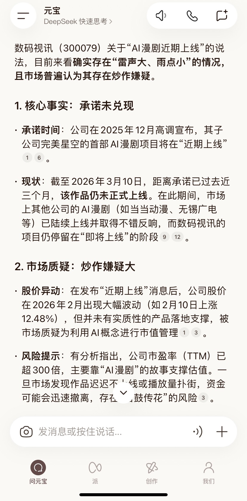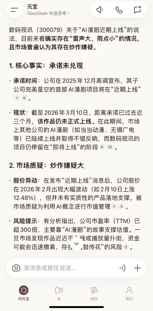 数码视讯(300079)关于“AI漫剧近期上线”的说法,目前来看确实存在“雷声大、雨点小”的情况,且市场普遍认为其存在炒作嫌疑。1. 核心事实:承诺未兑现• 承诺时间:公司在2025年12月高调宣布,其子公司完美星空的首部AI漫剧项目将在“近期上线”。• 现状:截至2026年3月10日,距离承诺已过去近三个月,该作品仍未正式上线。在此期间,市场上其他公司的AI漫剧(如当当动漫、无锡广电等)已陆续上线并取得不错反响,而数码视讯的项目仍停留在“即将上线”的阶段。2. 市场质疑:炒作嫌疑大$数码视讯(SZ300079)$ • 股价异动:在发布“近期上线”消息后,公司股价在2026年2月出现大幅波动(如2月10日上涨12.48%),但并未有实质性的产品落地支撑,被市场质疑为利用AI概念进行市值管理。• 风险提示:有分析指出,公司市盈率(TTM)已超300倍,主要靠“AI漫剧”的故事支撑估值。一旦市场发现作品迟迟不上线或播放量扑街,资金可能会迅速撤离,存在“击鼓传花”的风险。3. 官方回应:仍在“关注”阶段$上证指数(SH000001)$ • 在2026年2月25日的最新投资者互动中,公司并未给出明确的上线时间表,仅表示“关注AIGC技术在漫剧工业化生产等环节的应用”,这与三个月前“近期上线”的承诺相比,显得较为保守和模糊@财联社 @财中社 @界面新闻