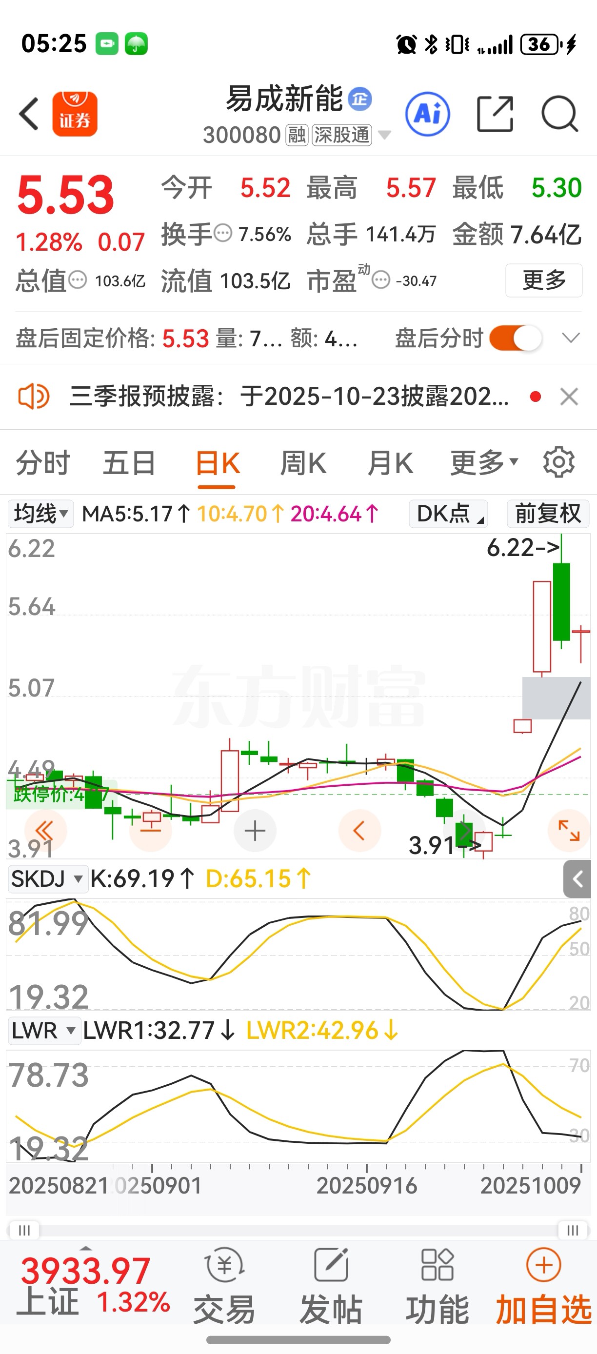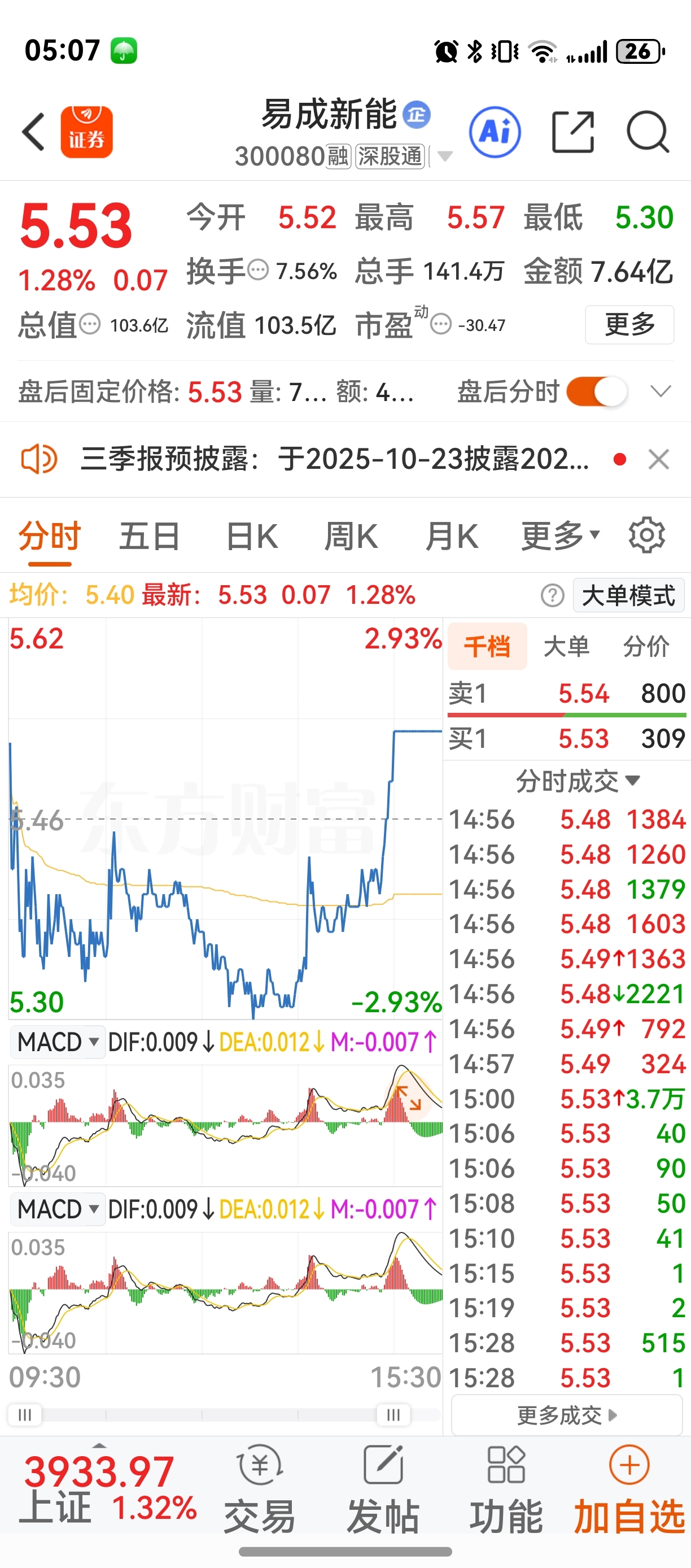 $易成新能(SZ300080)$ 今天明明可以砸一下520确偏偏不砸留下一个小长腿,尾巴强行拉一个点,难道是还在强势中(不补520下方缺口,量也还在)咱们明天再看!