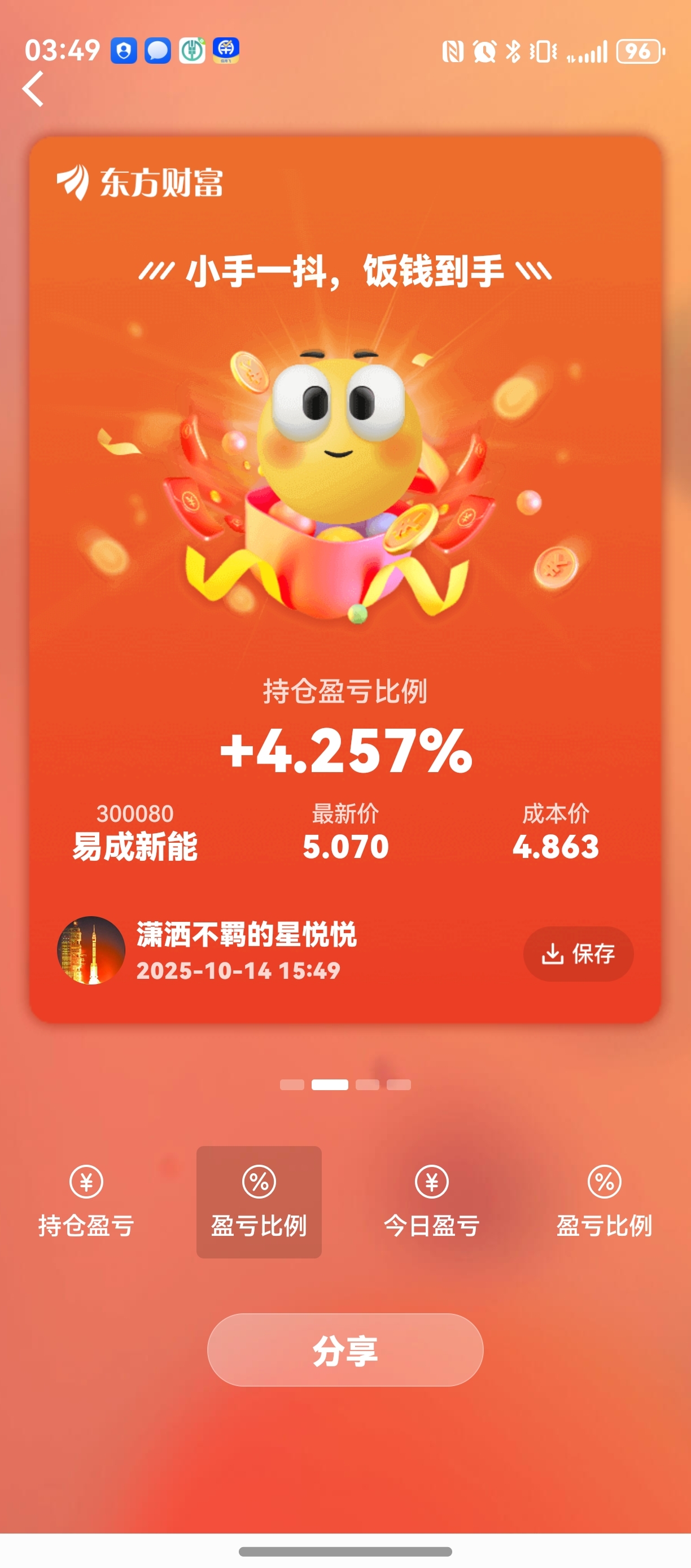 $易成新能(SZ300080)$ 早上赚一个点清仓了,谁知道下午又回5元了,一看没忍住手,又买四分之一回来了!
