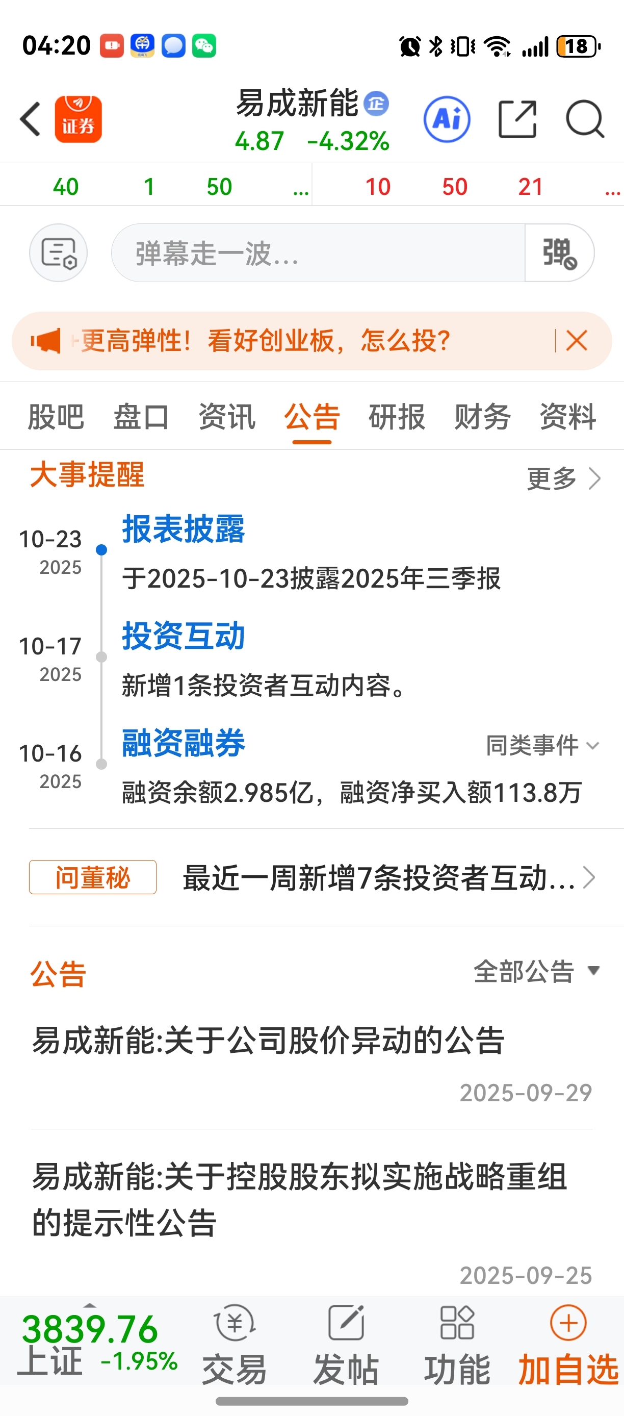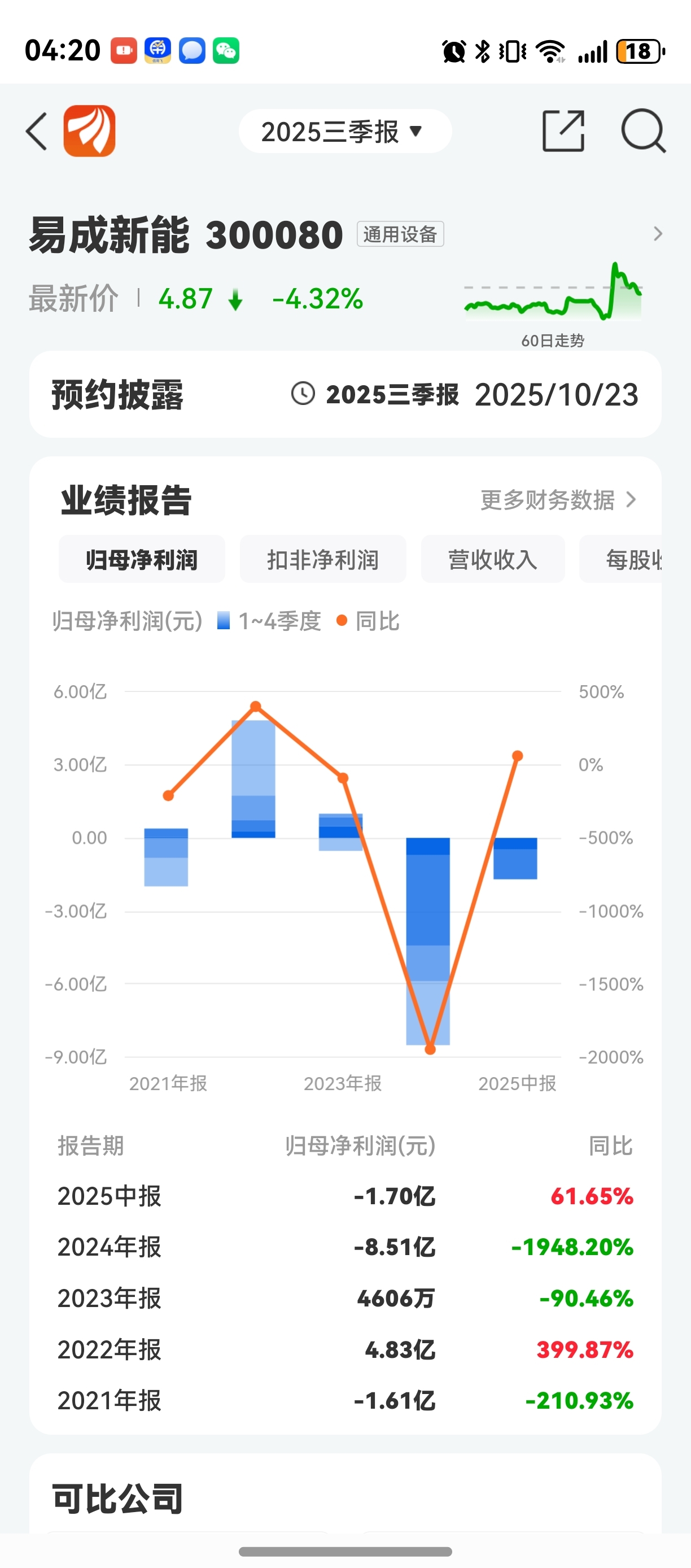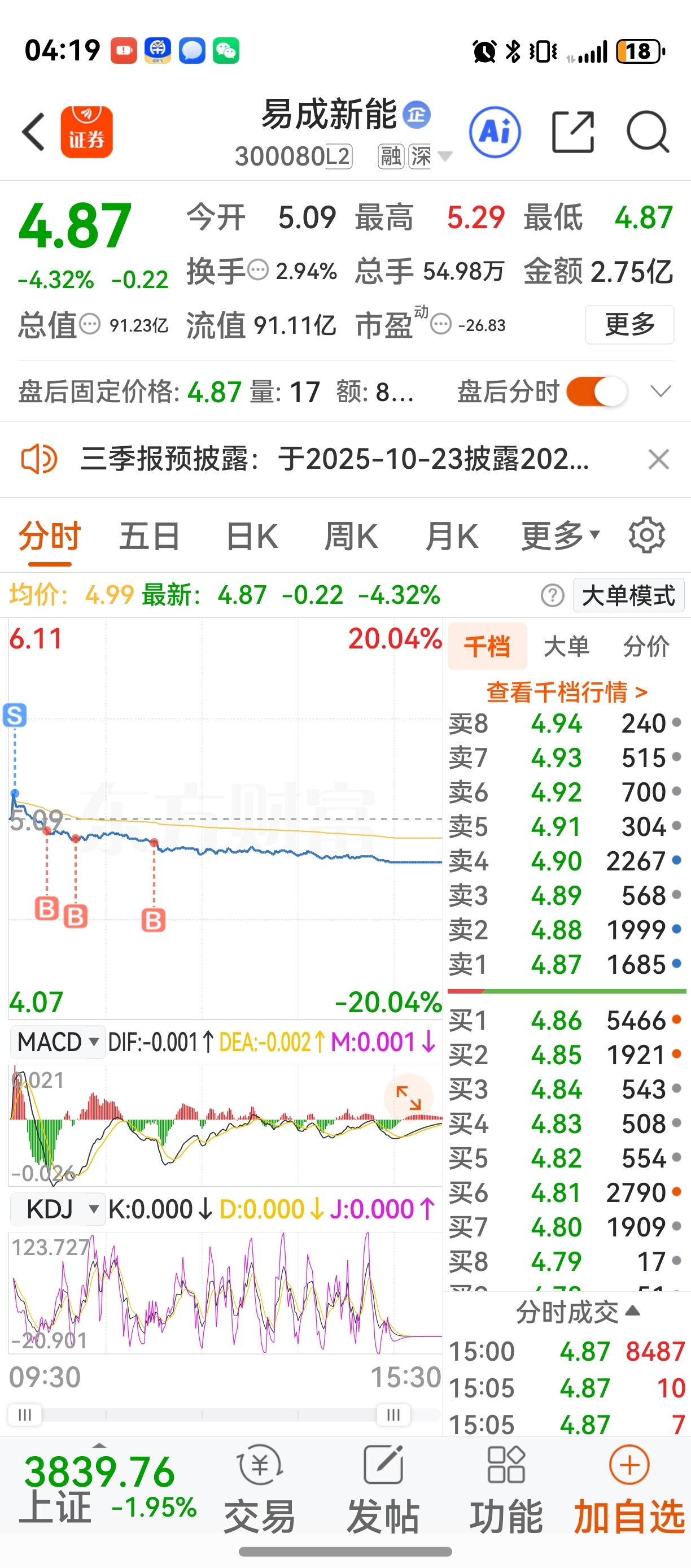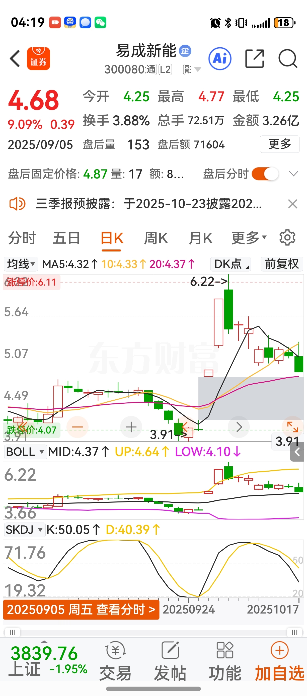 $易成新能(SZ300080)$ 哈哈上周五倒踢,下周应正踢了,前面那根大阳日线4.68处应该是有很强的支撑点(挖坑拉两个板,下周再绿几个点就没剩多少了)另外季报23就公布,赌它业绩继续成亏中!(给机会就进补点,等着反抽做T)