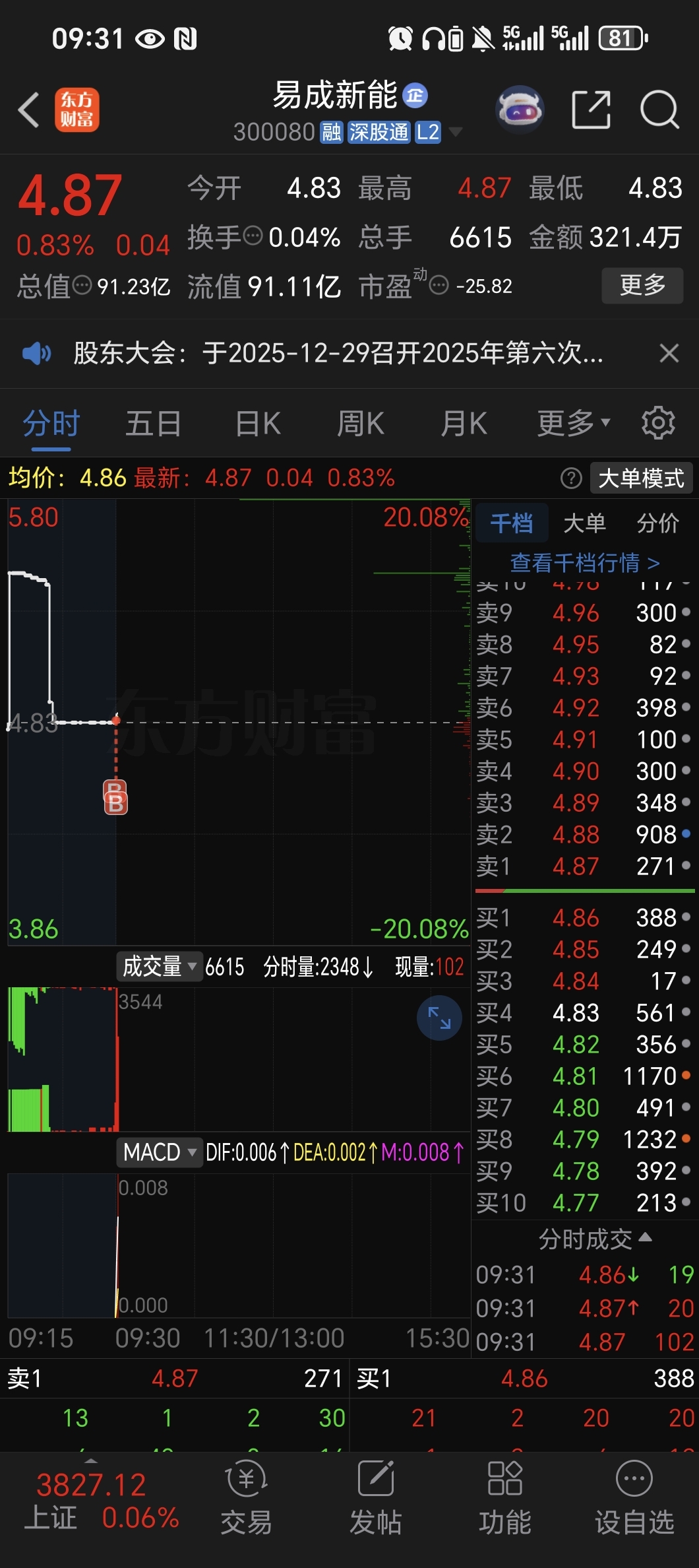 $易成新能(SZ300080)$ 每日压制,买入20手,持仓220手,敢拉就T