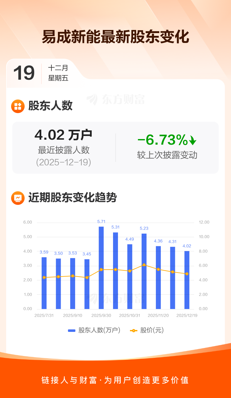 易成新能:截至12月19日最新股东户数4.02万户,较上期减少6.73%
