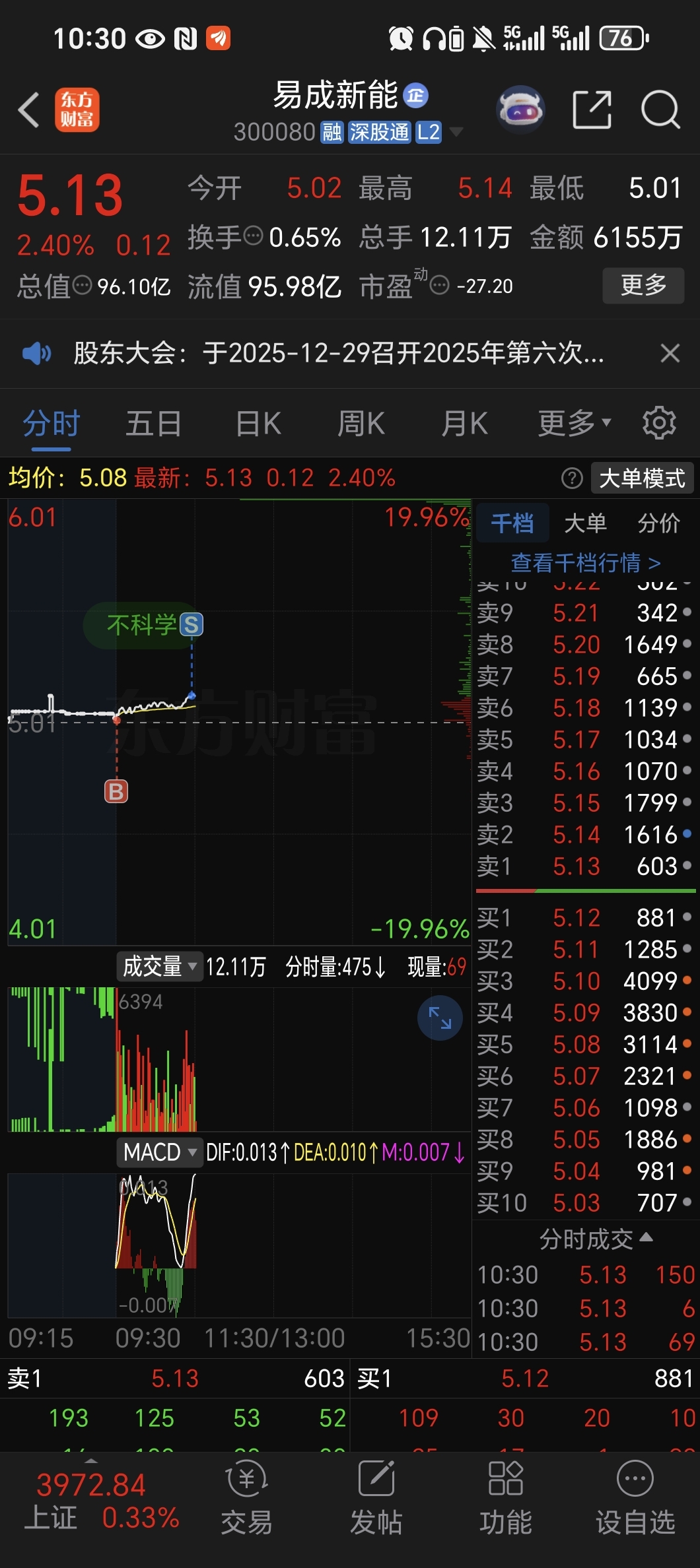 $易成新能(SZ300080)$ 卖出50手,做个小T,今天可以吃顿火锅了